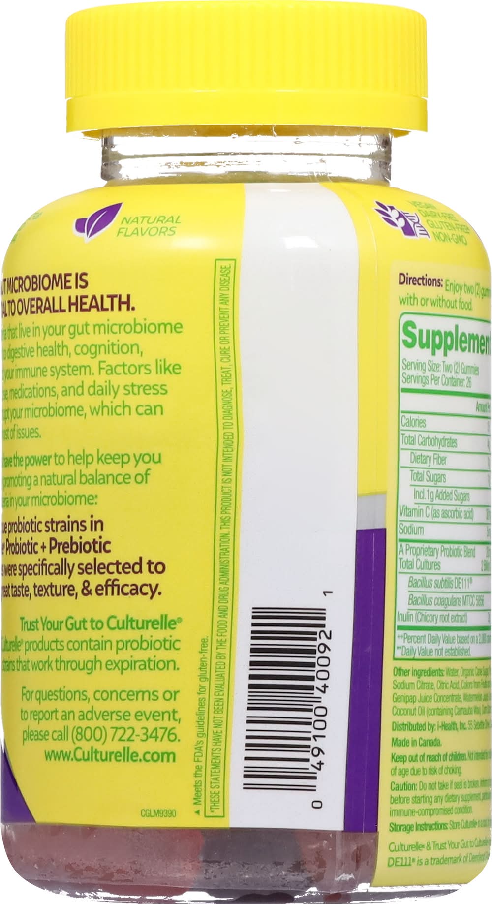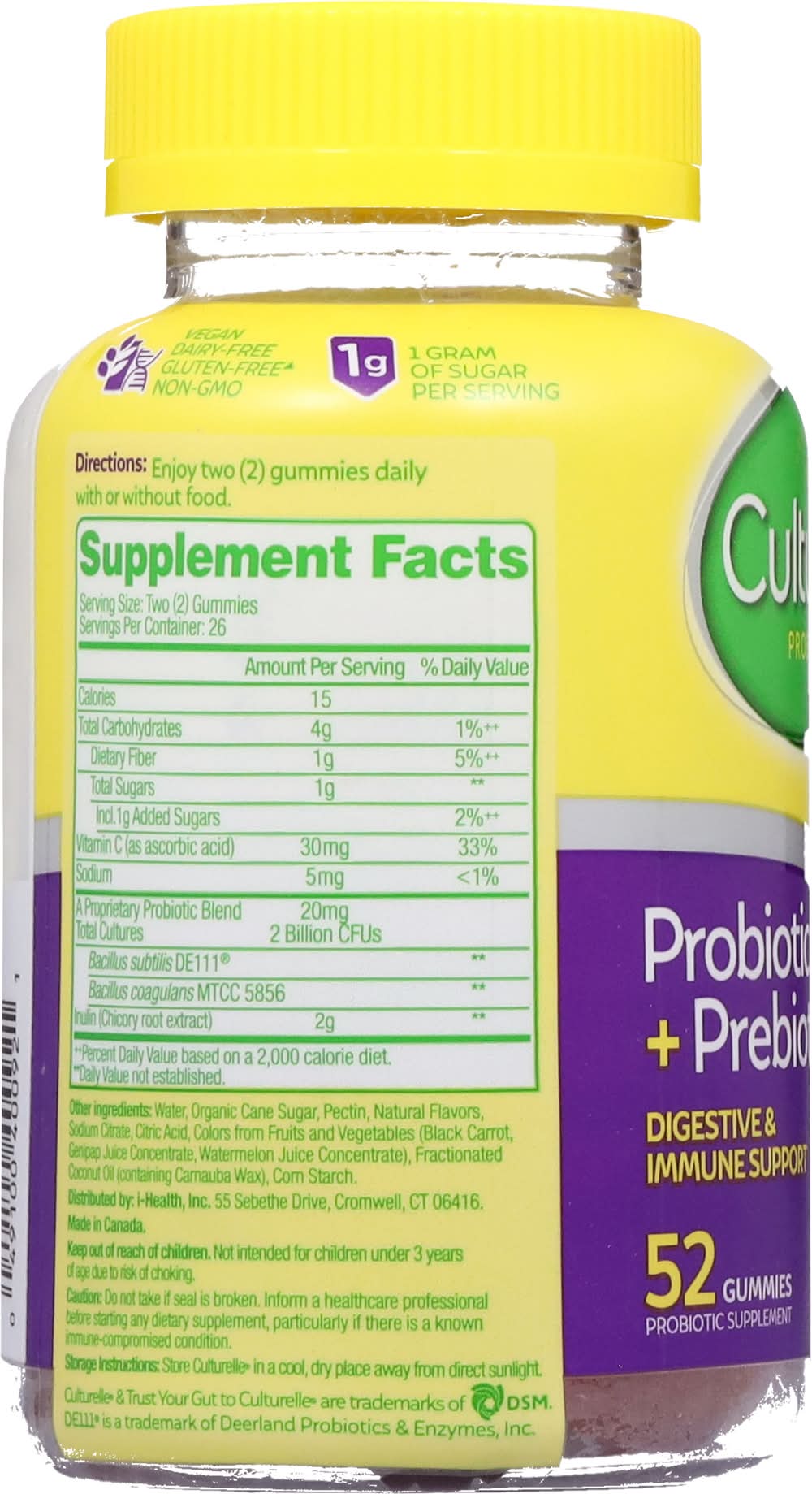 Directions for use: Enjoy two (2) gummies daily with or without food.Caution: Do not take if seal is broken. Inform a healthcare professional before starting any dietary supplement, particularly if there is a known immune-compromised condition.,Keep out of reach of children. Not intended for children under 3 years of age due to risk of choking.Enjoy two (2) gummies daily with or without food. Storage Instructions: Store Culturelle in a cool, dry place away from direct sunlight. Open: Push down & turn. Close tightly Storage recommendation: Storage Instructions: Store Culturelle in a cool, dry place away from direct sunlight.
