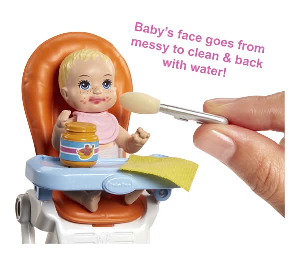 This bedtime-themed Barbie Skipper Babysitters Inc. playset inspired by the movie lets kids explore their nurturing side with Skipper doll, a baby doll -with dreamy sleep feature -a crib and storytelling pieces. Help give baby a bottle or pacifier and watch their eyes grow sleepy! Kids can collect all the Babysitters Inc. dolls and toys for endless Barbie babysitting adventures (each sold separately, subject to availability). Dolls cannot stand alone. Colors and decorations may vary. female