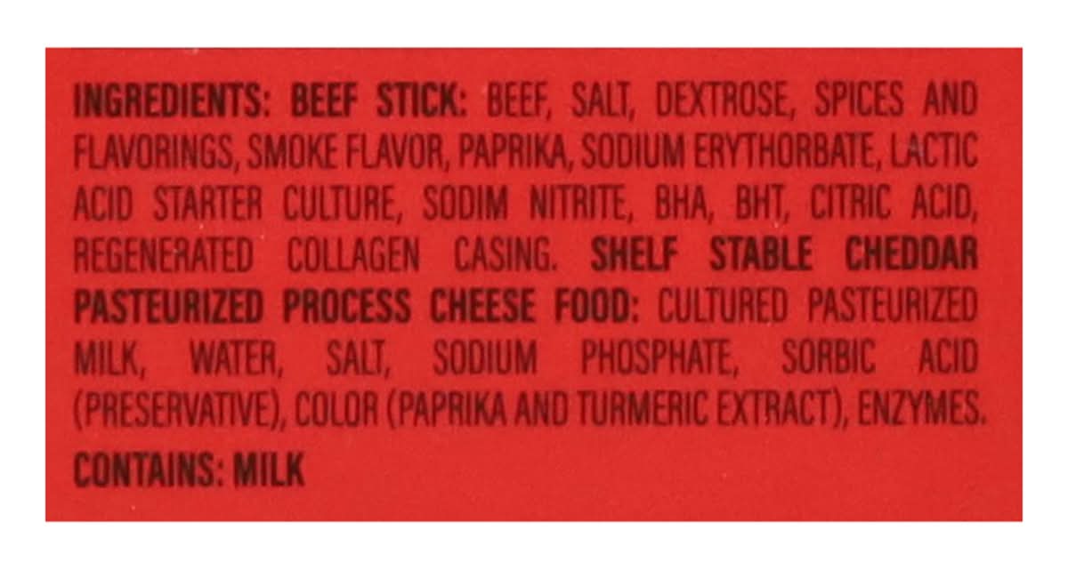 Ingredients: Beef Stick: Beef, Salt, Dextrose, Spices and Flavorings, Smoke Flavor, Paprika, Sodium Erythorbate, Lactic Acid Starter Culture, Sodium Nitrite, BHA, BHT, Citric Acid, Regenerated Collagen Casing. Shelf Stable Cheddar Pasteurized Process Cheese Food: Cultured Pasteurized Milk, Water, Salt, Sodium Phosphate, Sorbic Acid (Preservative), Color (Paprika and Turmeric Extract), Enzymes Contains: Milk