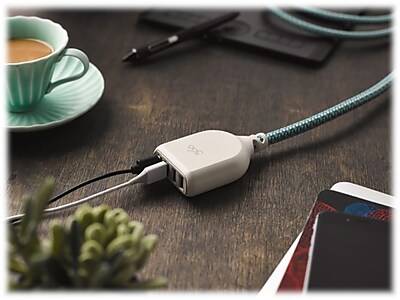 Connect devices to distant outlets with this 360 Electrical Habitat 4.8-amp 6-foot summer twilight-colored USB cable with four ports. Recharge multiple devices at once with this USB cable. The 6-foot length extends your reach to access out-of-the-way outlets, while the premium round braided cord stands up to heavy use without tearing or fraying. Featuring four built-in USB ports, this 360 Electrical Habitat 4.8-amp 6-foot summer twilight-colored USB cable with four ports lets you charge up to four devices at once. - Charging extension cord provides fast charge of all your devices simultaneously - 6' cable length - AC plug to four-port USB - Compatible with most smartphones - Voltage: 5V (output); max current: 4.8A; power: 24W - Comes in cream color - Low-profile, right-angle plug fits in tight spaces