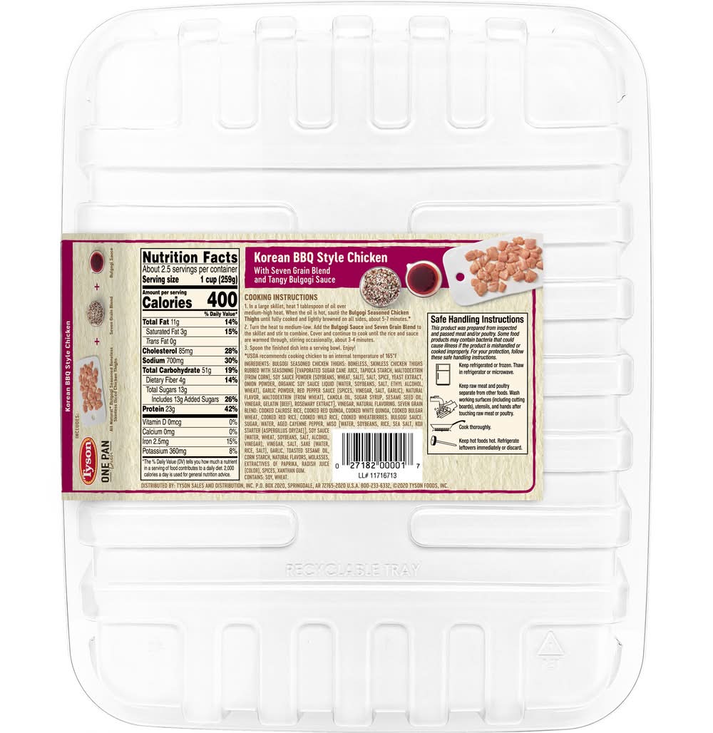 BULGOGI SEASONED CHICKEN THIGHS: Boneless, skinless chicken thighs rubbed with seasoning [evaporated sugar cane juice, tapioca starch, maltodextrin (from corn), soy sauce powder (soybeans, wheat, salt), salt, spice, yeast extract, onion powder, organic soy sauce liquid (water, soybeans, salt, ethyl alcohol, wheat), garlic powder, red pepper sauce (spices, vinegar, salt, garlic), natural flavor, maltodextrin (from wheat), canola oil, sugar syrup, sesame seed oil, vinegar, gelatin (beef), rosemary extract], vinegar, natural flavoring. SEVEN GRAIN BLEND: cooked calrose rice, cooked red quinoa, cooked white quinoa, cooked bulgar wheat, cooked red rice, cooked wild rice, cooked wheatberries. BULGOGI SAUCE: sugar, water, aged cayenne pepper, miso [water, soybeans, rice, sea salt, koji starter (aspergillus oryzae)], soy sauce (water, wheat, soybeans, salt, alcohol, vinegar), vinegar, salt, sake (water, rice, salt), garlic, toasted sesame oil, corn starch, natural flavors, molasses, extractives of paprika, radish juice (color), spices, xanthan gum. Contains: Soy, Wheat
