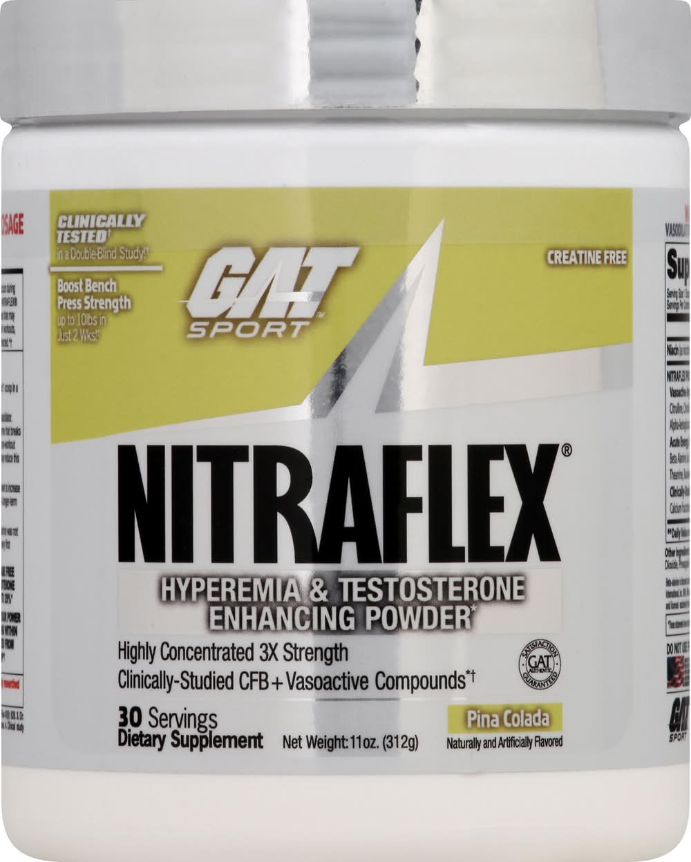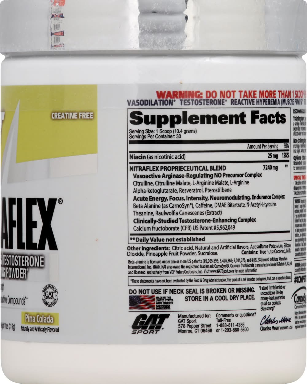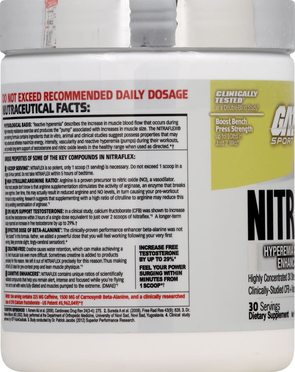 Nitraflex Proprieceutical Blend: Vasoactive Arginase-Regulating NO Precursor Complex: Citrulline, Citrulline Malate, L-Arginine Malate, L-Arginine Alpha-Ketoglutarate, Resveratrol, Pterostilbene, Acute Energy, Focus, Intensity, Neuromodulating, Endurance Complex, Beta Alanine (as CarnoSyn), Caffeine, DMAE Bitartrate, N-Acetyl-L-Tyrosine, Theanine, Raulwolfia Canescenes (Extract) Clinically-Studied Testosterone-Enhancing Complex, Calcium Fructoborate (CFB). Other Ingredients: Citric Acid, Natural and Artificial Flavors, Acesulfame Potassium, Silicon Dioxide, Pineapple Fruit Powder, Sucralose