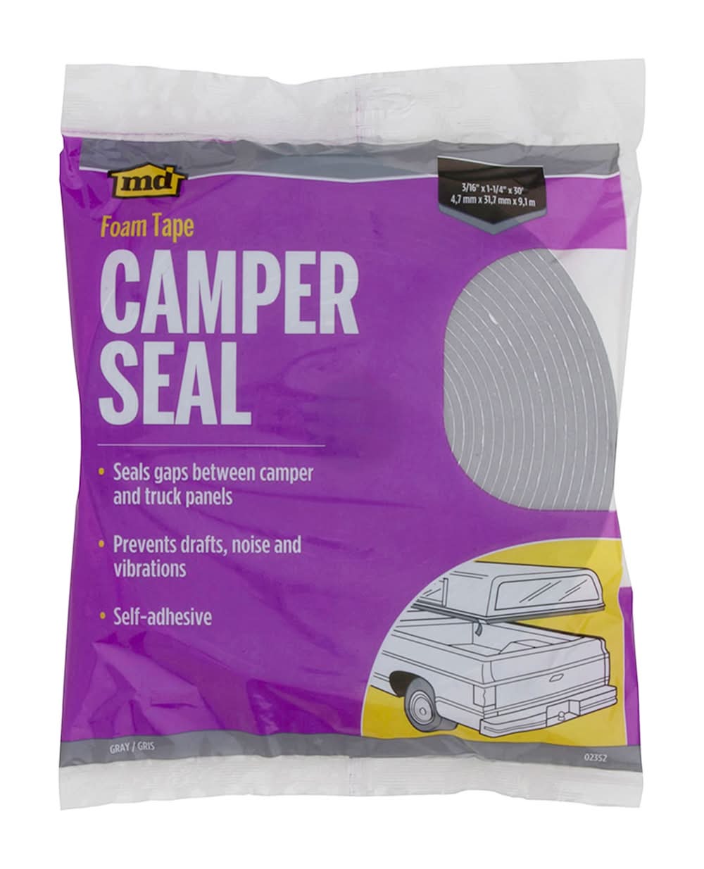 The M-D Foam Tape Camper Seal seals gaps between camper and truck panels to protect against drafts, noise and vibrations. Can also be used on residential doors and windows. Easy peel and stick installation. Before installation, cut to desired length by using scissors. • Color: Gray • Size: 30 ft