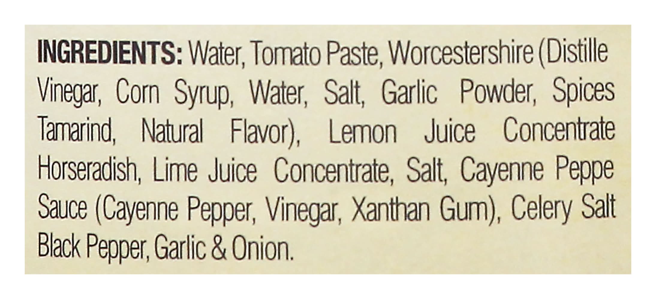 Water, Tomato Paste, Worcestershire (Distilled Vinegar, Corn Syrup, Water, Salt, Garlic Powder, Spices Tamarind, Natural Flavor), Lemon Juice Concentrate Horseradish, Lime Juice Concentrate, Salt, Cayenne Pepper Sauce (Cayenne Pepper, Vinegar, Xanthan Gum), Celery Salt Black Pepper, Garlic & Onion.