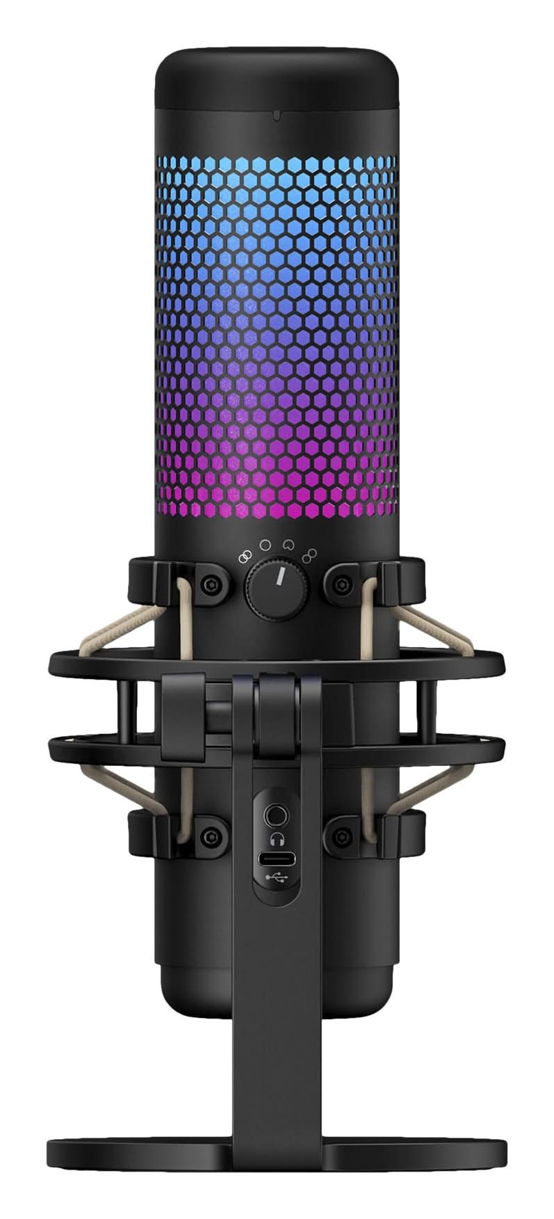 The HyperX QuadCast S is a USB condenser microphone that both sounds great and looks great. The supremely stunning RGB lighting and dynamic effects will add style and flair to any stream or setup and is customizable via HyperX NGENUITY software. The QuadCast S is an all-inclusive mic, featuring an anti-vibration shock mount to help quiet the rumbles of daily life and a built-in pop filter to muffle plosive sounds. - Microphone Type & Use: Condenser Microphone - Cord (Length and Type): 9.84ft - Design & True Color: Black - Microphone Technology: CondenserStereo - Omni-directional, Cardioid, Bi-directional - Shock Mount - Interface: USB 2.0 Type C, Mini-phone - Microphone Sensitivity (decibels): -36dB (1V/Pa at 1kHz) - Frequency Response: 20Hz - 20kHz - Power Source: USB - 1 Year Warranty