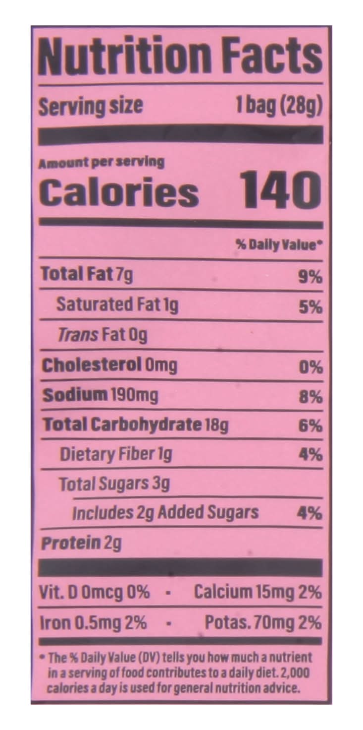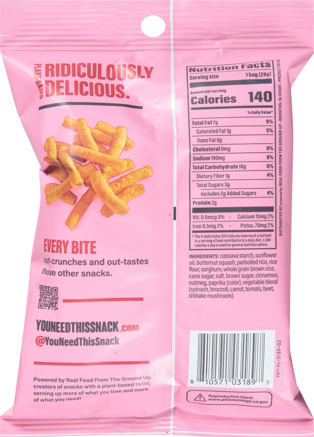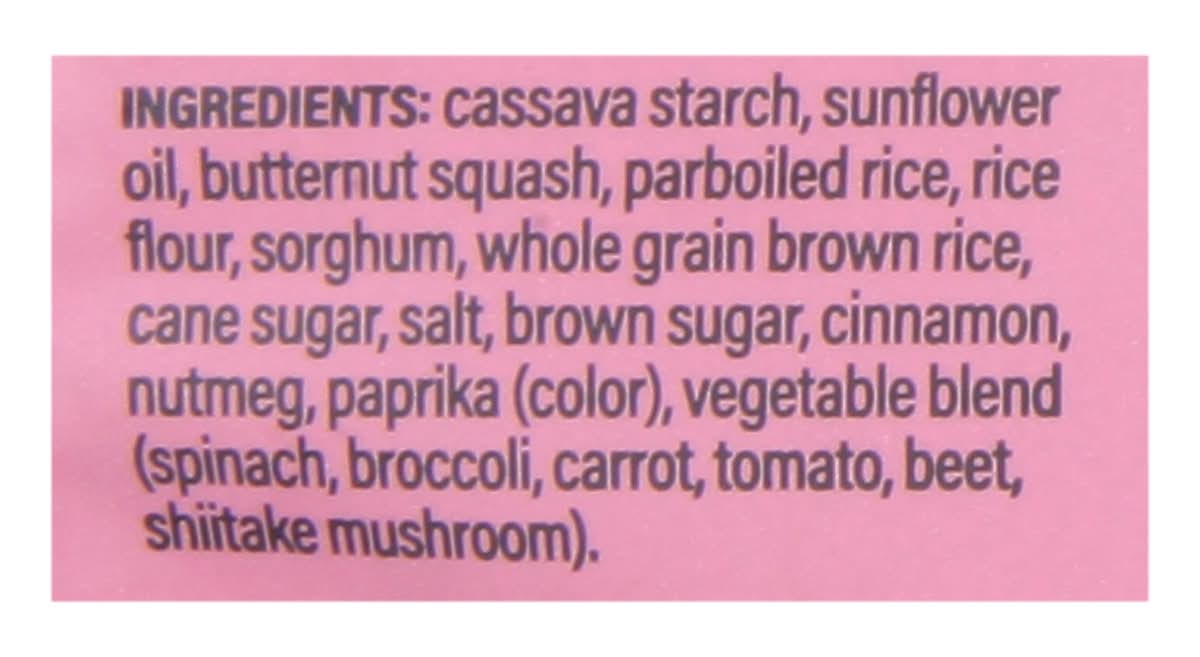 Cassava Starch, Sunflower Oil, Butternut Squash, Parboiled Rice, Rice Flour, Sorghum, Whole Grain Brown Rice, Cane Sugar, Salt, Brown Sugar, Cinnamon, Nutmeg, Paprika (Color), Vegetable Blend (Spinach, Broccoli, Carrot, Tomato, Beet, Shiitake Mushroom) Contains: Tree Nuts, Walnuts/Butternuts