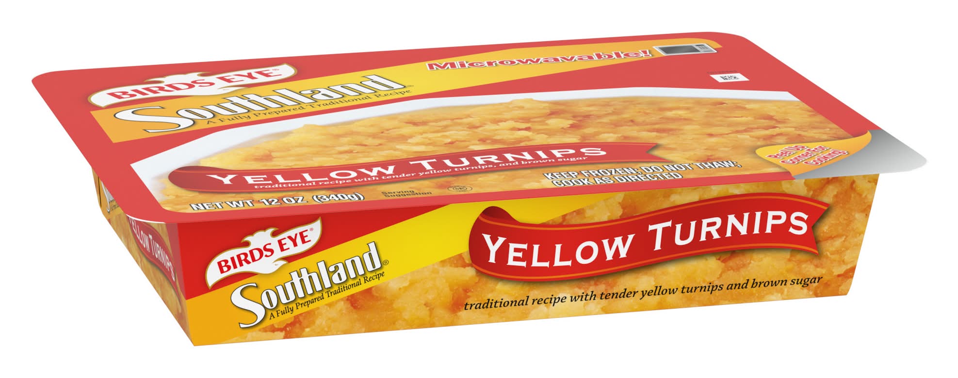 Enjoy the taste of Birds Eye Southland Yellow Turnips made with tender yellow turnips and brown sugar • Conagra, Chicago, IL, 60654 • Packaging: Reusable