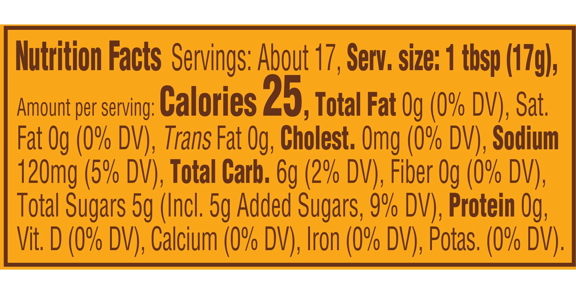 TOMATO PUREE (WATER, TOMATO PASTE), DISTILLED WHITE VINEGAR, HIGH FRUCTOSE CORN SYRUP, HONEY, DARK BROWN SUGAR, CONTAINS LESS THAN 2% OF THE FOLLOWING: MODIFIED FOOD STARCH, MOLASSES, SALT, RAISIN JUICE CONCENTRATE, MALT VINEGAR (CONTAINS BARLEY), APPLE PUREE, SOYBEAN OIL, SPICES, MUSTARD FLOUR, TURMERIC, GARLIC POWDER, ONION POWDER, SODIUM BENZOATE AND POTASSIUM SORBATE (PRESERVATIVES), NATURAL AND ARTIFICIAL FLAVORS, INVERT SUGAR, SUGAR.