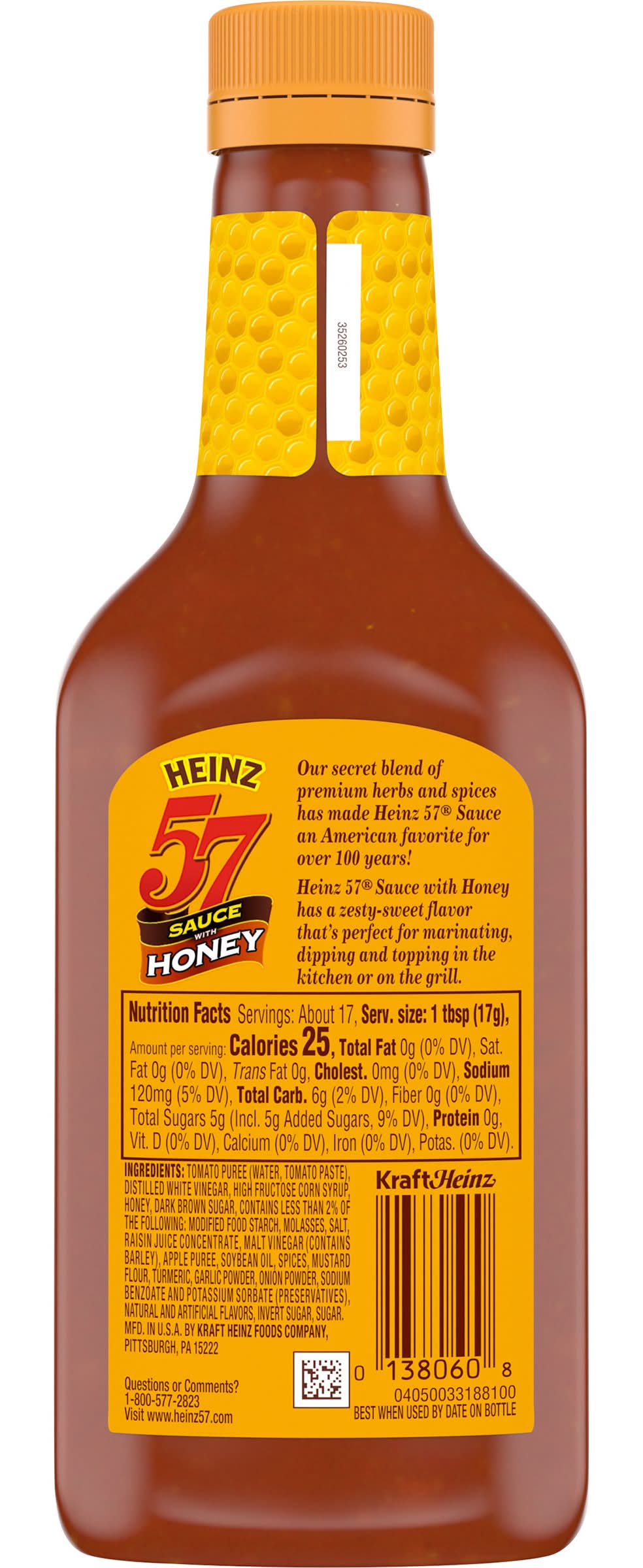 Heinz 57 Sauce With Honey is made with a secret blend of premium herbs and spices that has made Heinz 57 steak sauce an American favorite for almost 100 years. This zesty sauce with honey has a one-of-a kind tangy-sweet flavor and is the perfect choice whether you're grilling, marinating or in need of a delicious dipping sauce. This multi use sauce is so versatile you can serve it with almost anything. Serve it with your steak dinner, use it as a sauce for pork, or for meat marinating. Heinz 57 Sauce with Honey also makes a great chicken dinner sauce. Packaged in a resealable bottle to help lock in flavor Heinz North America,