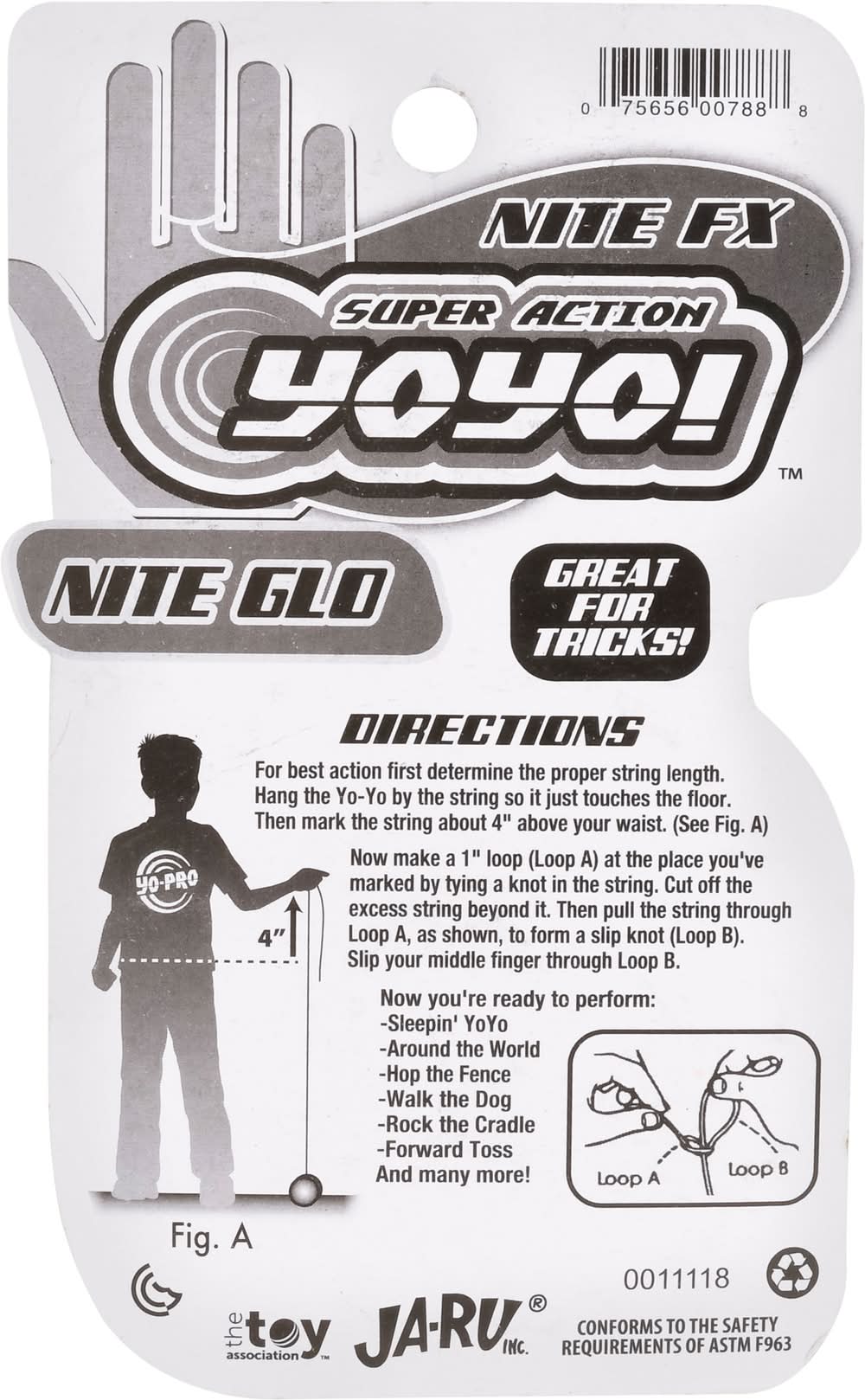Usage of instructions:Directions: For best actions first determine the proper string length. Hang the yo-yo by the string so it just touches the floor. Then mark the string about 4 inches above your waist. (See fig. A). Now make a 1 inches loop (loop A) at the place you've marked by tying a knot in the string. Cut off the excess string beyond it. Then pull the string through loop A, as shown, to form a slip knot (loop B). Slip your middle finger through loop B. Now you're Ready to Perform: sleepin' yo yo; around the world; hop the fence; walk the dog; rock the cradle; forward toss and many more! - Directions: For best actions first determine the proper string length. Hang the yo-yo by the string so it just touches the floor. Then mark the string about 4 inches above your waist. (See fig. A). Now make a 1 inches loop (loop A) at the place you've marked by tying a knot in the string. Cut off the excess string beyond it. Then pull the string through loop A, as shown, to form a slip knot (loop B). Slip your middle finger through loop B. Now you're Ready to Perform: sleepin' yo yo; around the world; hop the fence; walk the dog; rock the cradle; forward toss and many more!