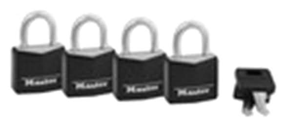 Master Lock Covered Aluminum Padlocks feature a black vinyl-covered body that enhances scratch and corrosion resistance. Each padlock is equipped with a hardened steel shackle designed to resist cutting and sawing, ensuring robust security. The padlocks include a 4-pin cylinder to prevent picking and dual locking levers that guard against prying and hammering. For added convenience, each set comes with matching color key heads.