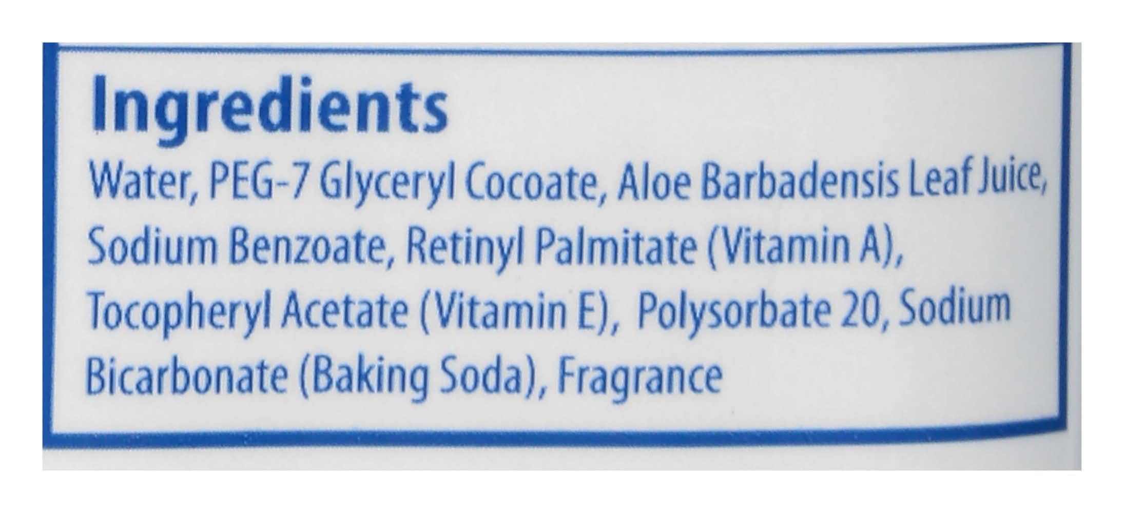 Inactive Ingredients: Water, PEG-7 Glyceryl Cocoate, Aloe Barbadensis Leaf Juice, Sodium Benzoate, Retinyl Palmitate (Vitamin A), Tocopheryl Acetate (Vitamin E), Polysorbate 20, Sodium Bicarbonate (Baking Soda), Fragrance