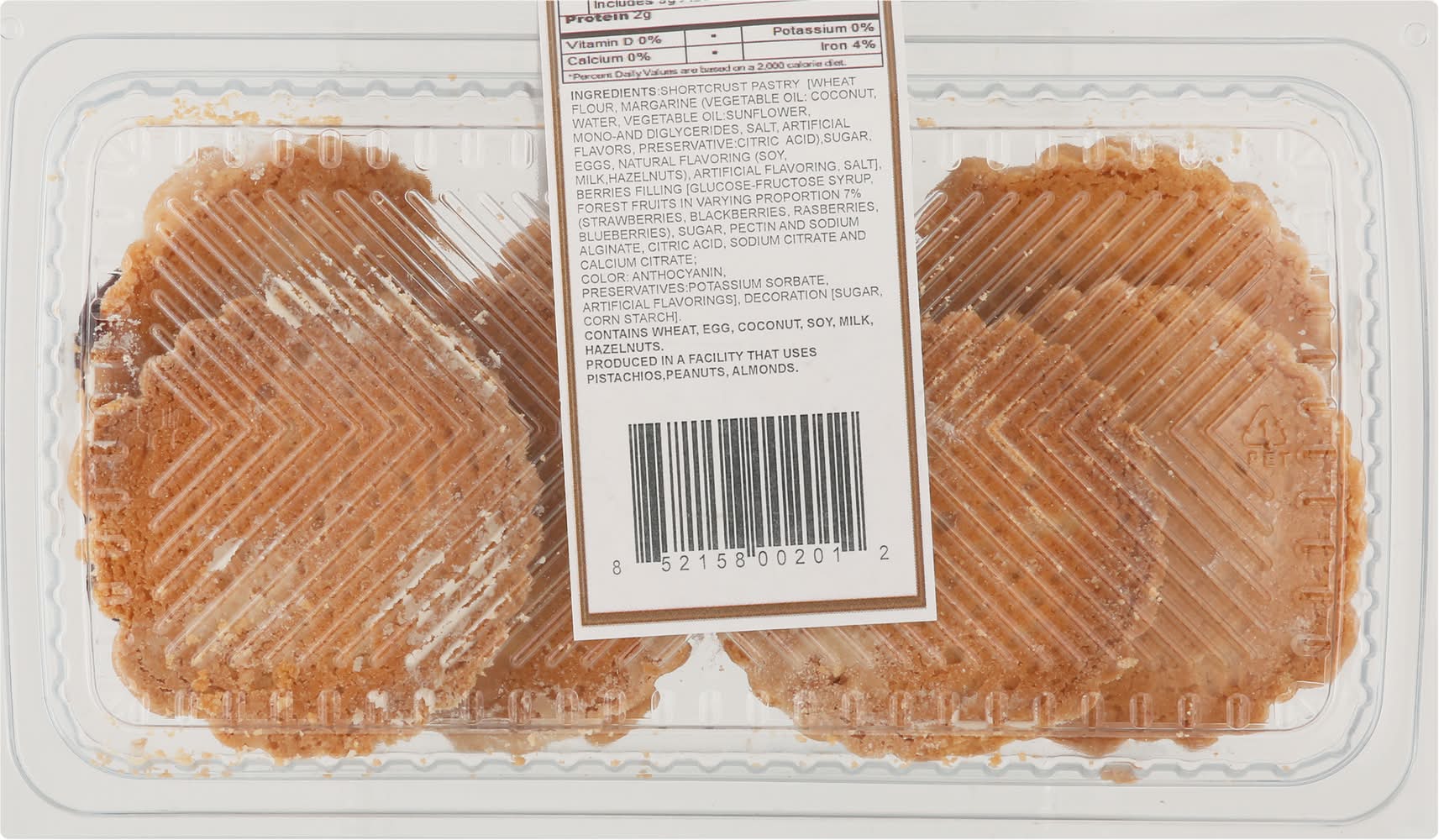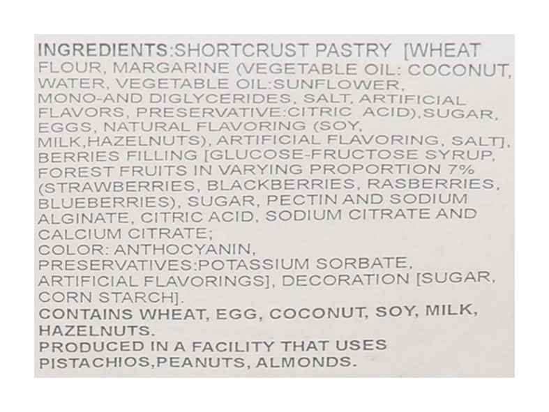 Shortcrust Pastry [Wheat Flour, Margarine (Vegetable Oil: Coconut Water, Vegetable Oil:Sunflovver, Mono-and Diglycerides, Salt, Artificial Flavors, Preservative: Citric Acid), Sugar, Eggs, Natural Flavoring (Soy, Milk, Hazelnuts), Artificial Flavoring, Salt], Berries Filling [Glucose-Fructose Syrup, Forest Fruits in Varying Proportion 7% (Strawberries, Blackberries, Rasberries, Blueberries), Sugar, Pectin and Sodium Alginate, Citric Acid, Sodium Citrate and Calcium Citrate; Color: Anthocyanin, Preservatives: Potassium Sorbate, Artificial Flavorings], Decoration [Sugar, Corn Starch] Contains: Wheat, Eggs, Tree Nuts, Coconuts, Soybeans, Milk, Tree Nuts, Hazelnuts/Filberts, Corn, Tree Nuts, Pistachios, Peanuts, Tree Nuts, Almonds