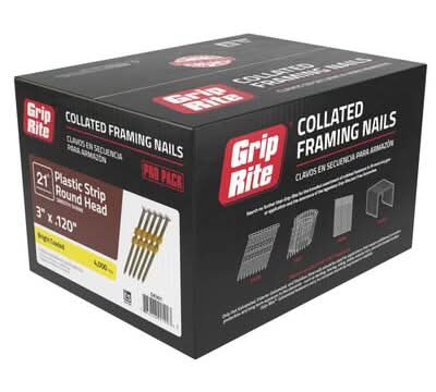 Grip-Rite GR301 3 in. x 0.120 in. 21° Plastic Collated Bright Coated Smooth Shank Round Head Framing Nails are compatible with all 21° pneumatic nailers. Uncoated for easy, flush, or countersunk installation. All Grip-Rite collated nails are backed by the Grip-Rite Jam Free Guarantee. You'll love how quickly you can complete framing projects with our best-selling fasteners. Size: 3X0.120 in