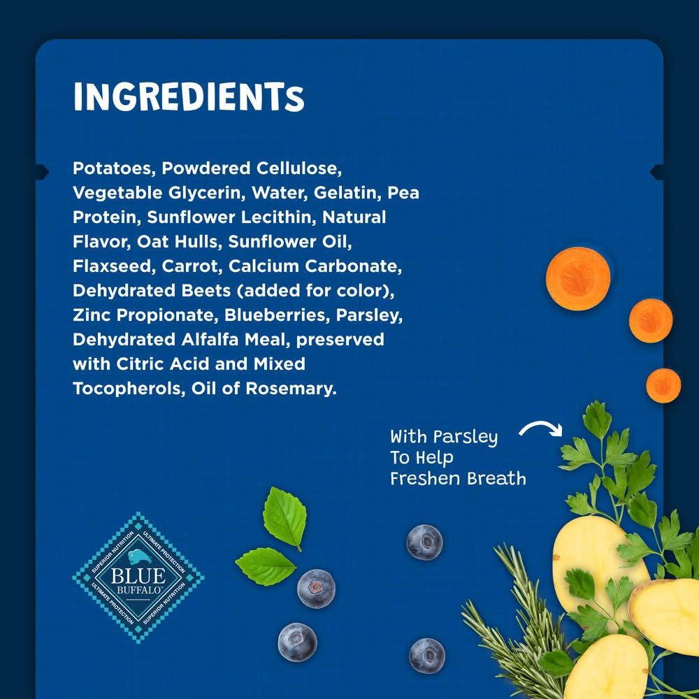 Potatoes, Powdered Cellulose, Vegetable Glycerin, Water, Gelatin, Pea Protein, Sunflower Lecithin, Natural Flavor, Oat Hulls, Sunflower Oil, Flaxseed, Carrot, Calcium Carbonate, Dehydrated Beets (added for color), Zinc Propionate, Blueberries, Parsley, Dehydrated Alfalfa Meal, preserved with Citric Acid and Mixed Tocopherols, Oil of Rosemary