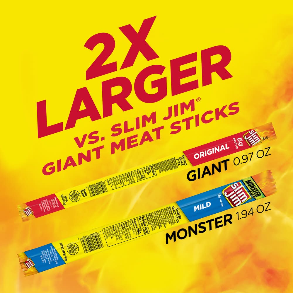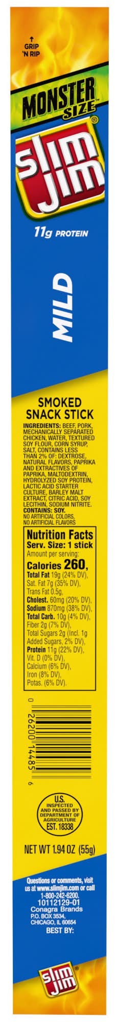 Experience intense, smoky flavor with delicious Slim Jim Monster Size Mild Meat Stick. Made with beef, pork and chicken, these snack sticks contain no artificial flavors or colors for full meaty flavor everyone can love. Each meat stick serving is loaded with 11 grams of protein, ideal for protein snacks that kick hunger to the curb and leave you feeling satisfied. These individually wrapped snacks go where you go and are perfect as travel snacks, school snacks or anywhere meat snacks. Slim Jim Monster Size Mild Meat Sticks offer a bold and tasty way to take on the day. Each package contains one of the meat sticks, perfect as individual snacks when savory cravings hit. Slim Jim keeps it interesting with a full line of beef sticks, snack sticks, pork rinds and jerky. Snap into a Slim Jim®!
