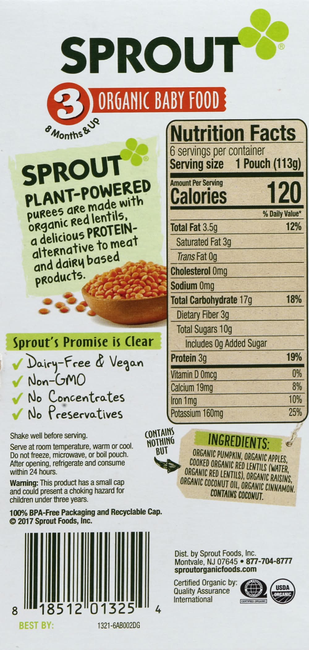 Sprout Organics Stage 3 Baby Food, Pumpkin Apple - Red Lentil - Cinnamo (24 oz, 6 ct)