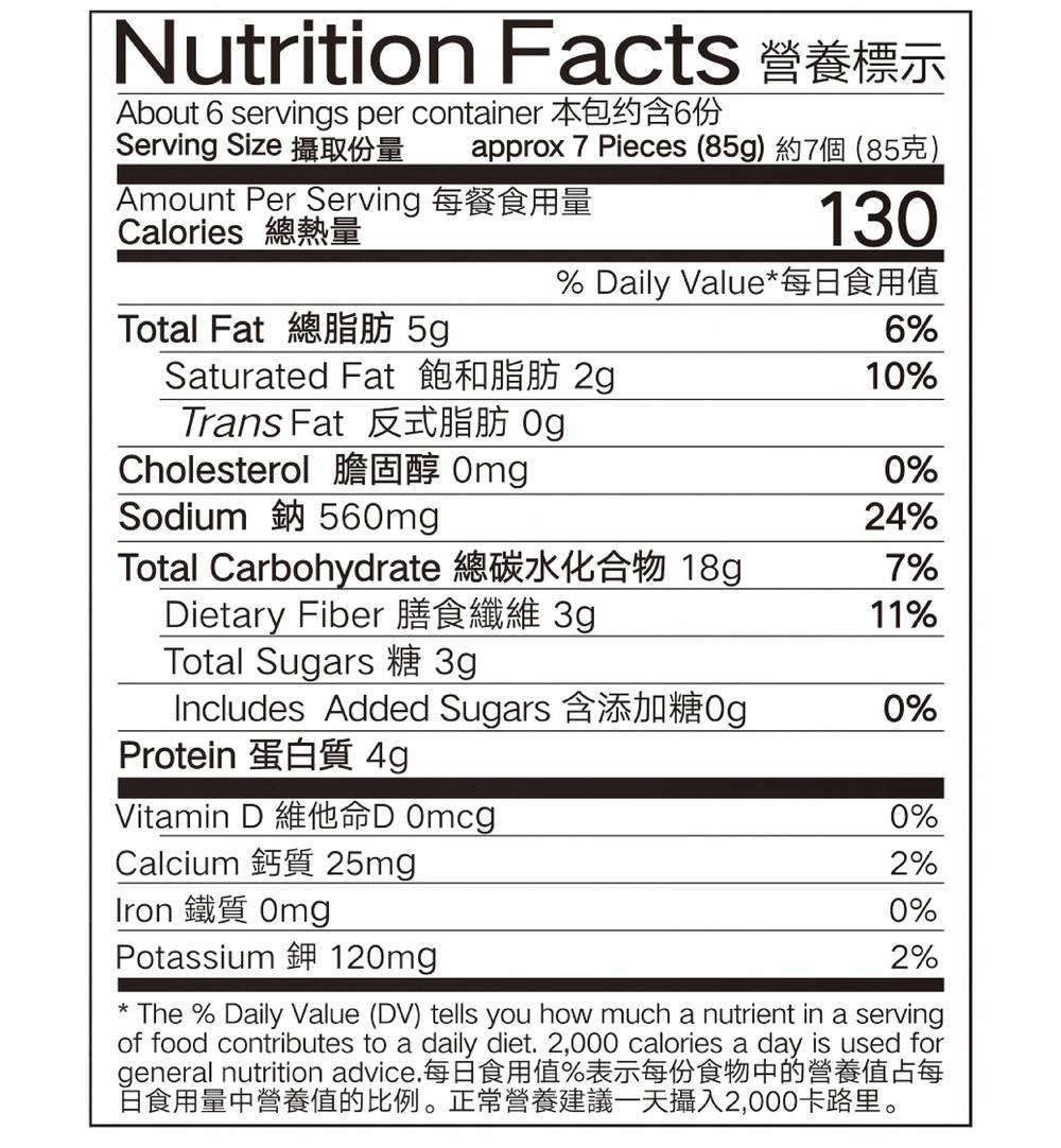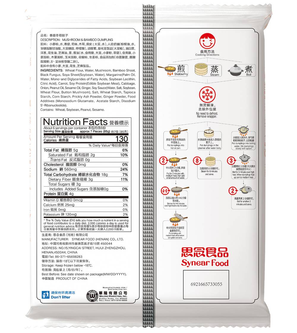 Wheat Flour,, Water,, Mushroom,, Bamboo Shoot,, Black Fungus,, Soya Sheet(Soybean, Water),, Margarine (Palm Oil, Water, Mono-and Diglycerides of Fatty Acids, Soybean Lecithin, Citric Acid),, Carrot,, Soy Protein (Edible Soybean Meal),, Cabbage,, Onion,, Peanut Oil,, Sesame Oil,, Ginger,, Soy Sauce (Water, Salt, Soybean, Wheat Flour, Button Mushroom),, Salt,, Wheat Starch,, Tapioca Starch,, Corn Starch,, Prickly Ash Powder,, Ginger Powder,, Food Additives (Monosodium Glutamate, Acetate Starch, Disodium 5'-Ribonucleotide). Contains: Wheat, Soybean, Peanut, Sesame, Corn