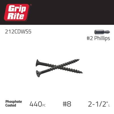 Grip-Rite 212CDWS5 #8 x 2-1/2 in. #2 Phillips Bugle Head Coarse Thread Drywall Screws are a hand drive fastener rated for interior gypsum drywall applications. Coated in black phosphate for a smoother drive, corrosion resistance, and mud adhesion, these are the perfect screws to hang drywall on wood studs. These hard-working fasteners feature a sharp point and bugle head for efficiency and a smooth finish. Commonly used with Sheetrock and other top selling gypsum drywall brands, the #2 Phillips drive reduces the chance of damage to material during installation. Our coarse thread drywall screws are a construction industry staple for a reason! Sheetrock is a registered trademark of United States Gypsum Company. Cancer and Reproductive Harm- www.P65Warnings.ca.gov Size: 8x2 1/2 in