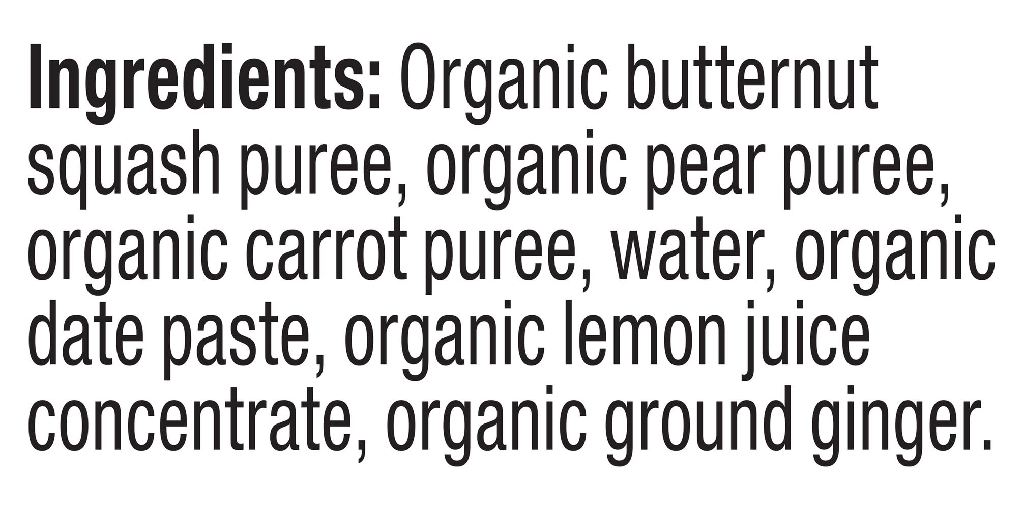 Organic Butternut Squash Puree, Organic Pear Puree, Organic Carrot Puree, Water, Organic Date Paste, Organic Lemon Juice Concentrate, Organic Ground Ginger Contains: Tree Nuts, Walnuts/Butternuts