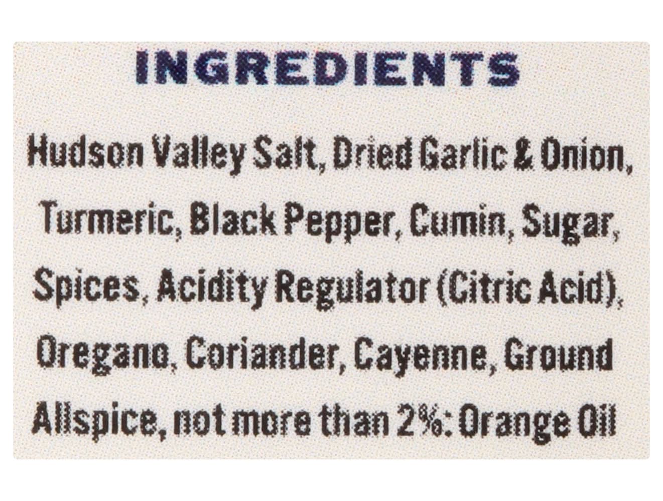 Hudson Valley Salt, Dried Garlic & Onion, Turmeric, Black Pepper, Cumin, Sugar, Spices, Acidity Regulator (Citric Acid), Oregano, Coriander, Cayenne, Ground Allspice, Not More than 2%: Orange Oil