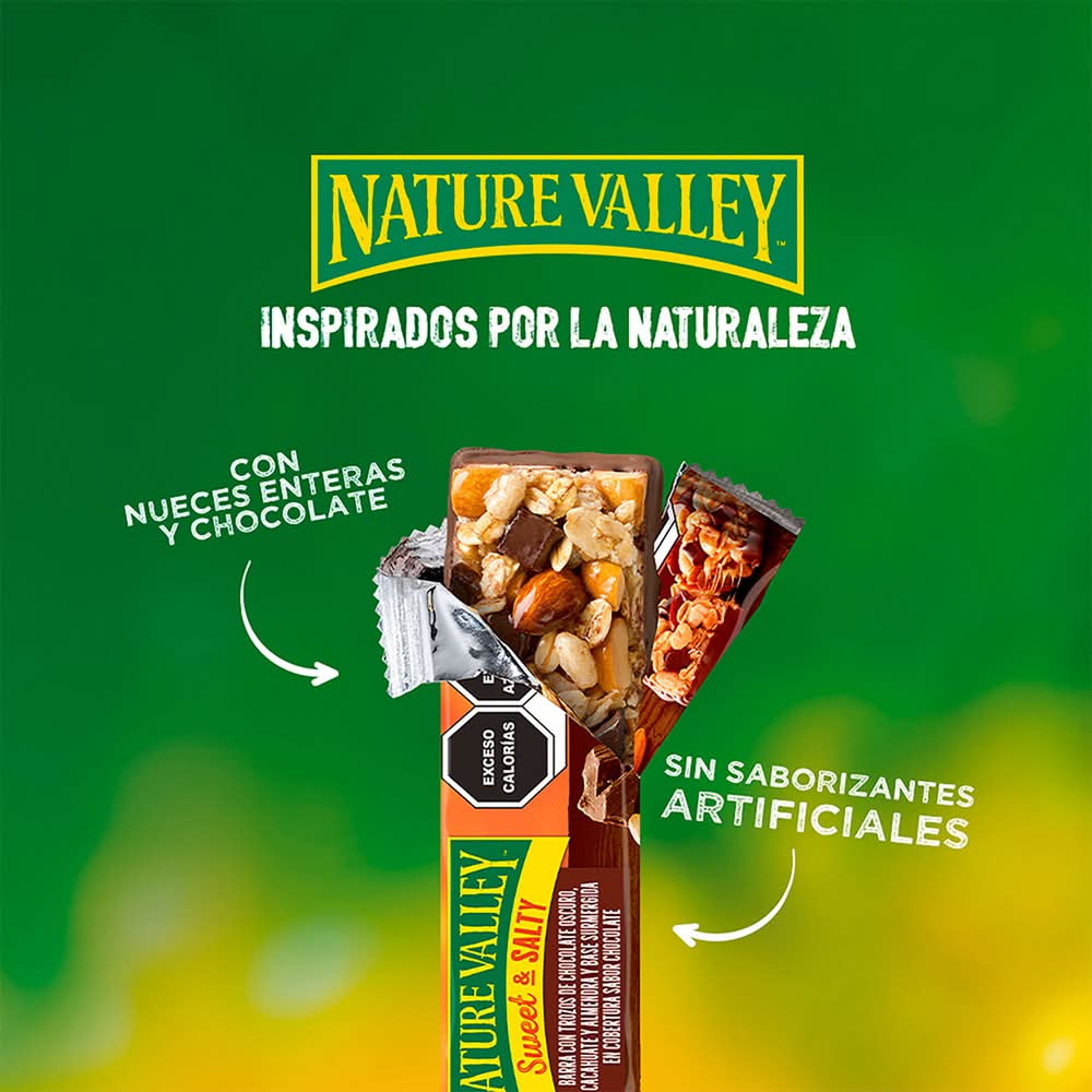 Encuentra tu naturaleza Nature Valley tiene para ti la combinación ideal de lo dulce con lo salado, las barras de granola Sweet and Salty serán tu snack o postre favorito, prácticas para llevarlas a todos lados y no quedarte con el antojo. - Deliciosa combinación de cacahuates, almendra, - Sumergida en una capa de cobertura de chocolate.