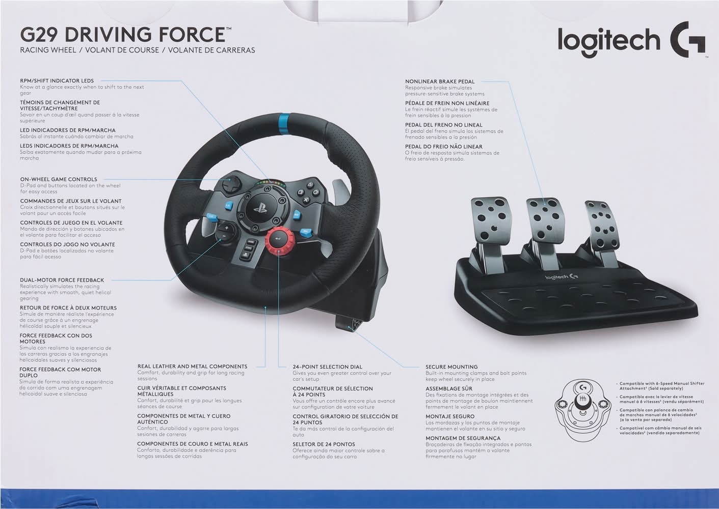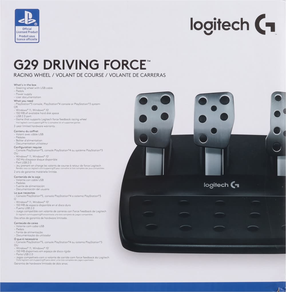 Designed for the latest PlayStation5, PlayStation4, and PC titles, G29 Driving Force features dual-motor force feedback and quiet helical gearing. On-wheel controls and RPM/Shift indicator LEDs help you make crisp, fluid gear transitions, while the pedals provide a quick, controlled response. Driving Force is built for comfort and durability with hand-stitched leather and stainless steel components. • Color: Black • Packaging: Reusable