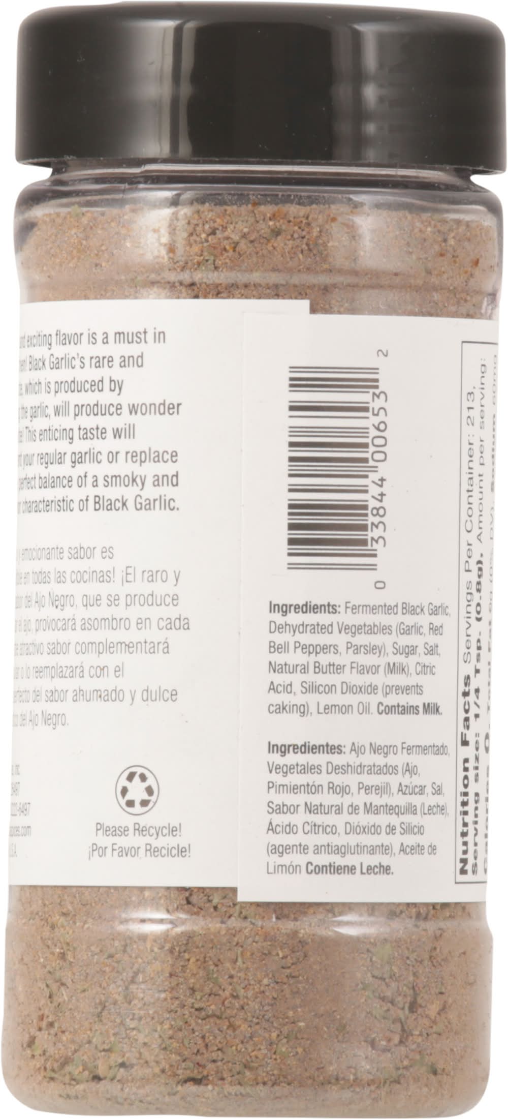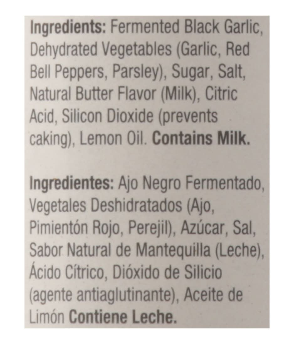 Fermented Black Garlic, Dehydrated Vegetables (Garlic, Red Bell Peppers, Parsley), Sugar, Salt, Natural Butter Flavor (Milk), Citric Acid, Silicon Dioxide (Prevents Caking), Lemon Oil Contains: Milk Additives: NONE