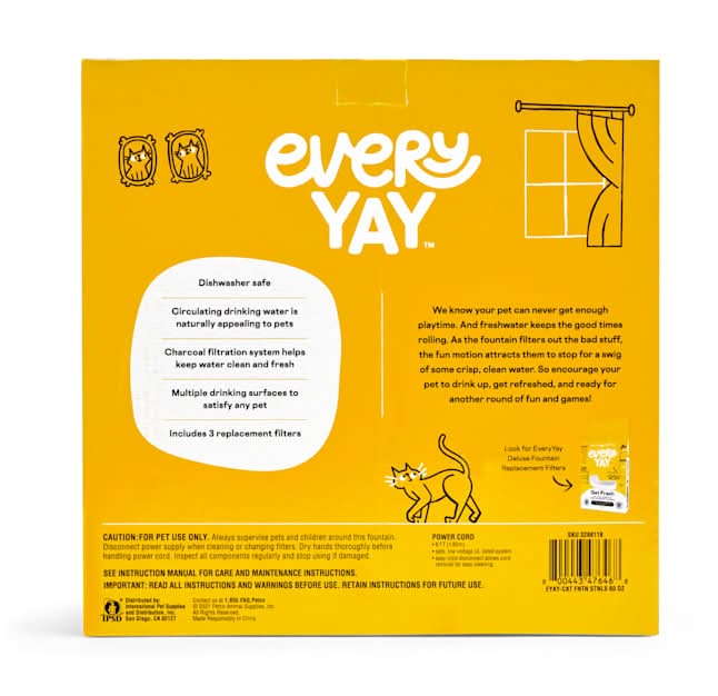 Pet Fountain filters and refreshes pets' water. The cascading water circulates filtered water which encourages pets to drink. Increased hydration is important to a pets' overall health. Cats don't instinctively know to drink, by providing moving water, cats are more attracted to the movement and will drink more frequently. The stylish design of the EveryYay Cascading Stainless Steel Pet Fountain holds 60 oz of water, which would be suitable for 1-2 cats or small dog.
