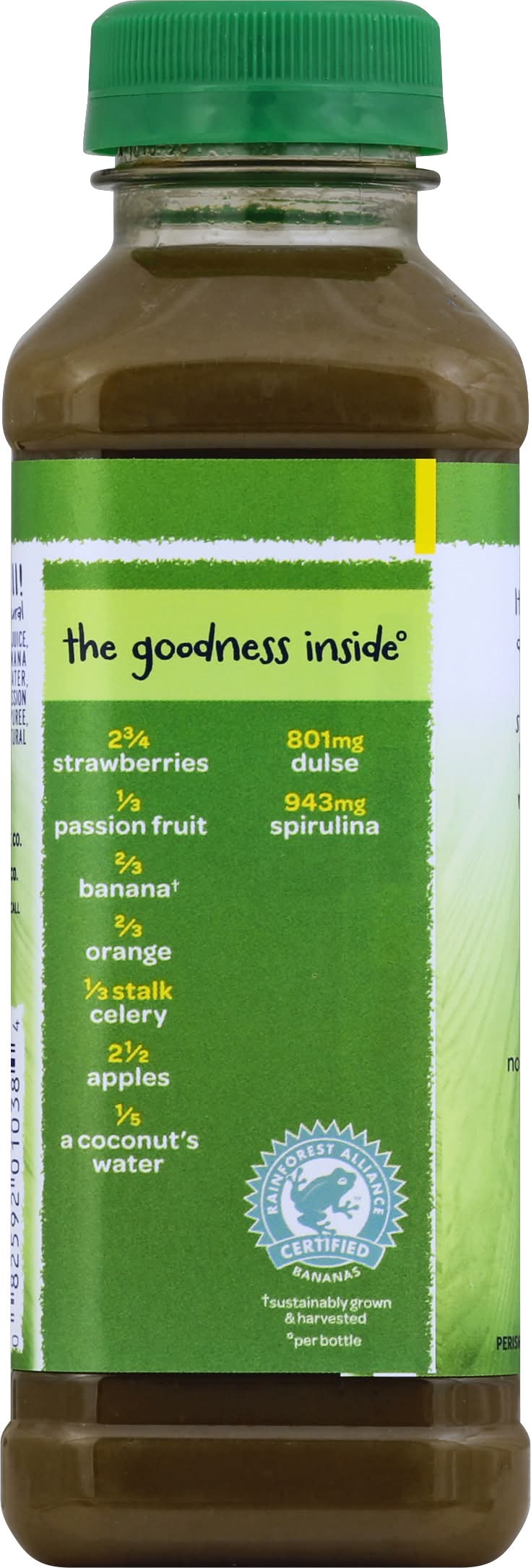 Apple Juice, Orange Juice, Banana Puree, Coconut Water, Strawberry Puree, Passion Fruit Juice, Celery Puree, Spirulina, Dulse, Natural Flavors Contains: Tree Nuts