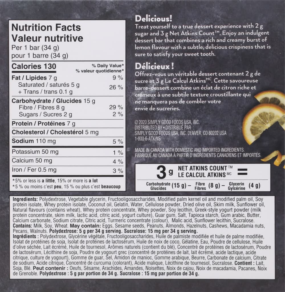 Atkins Endulge Treats Tart Dessert Bar, Lemon (170 g, 5 ct)
