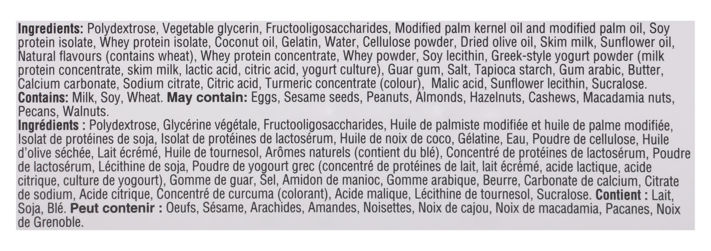 Polydextrose, Vegetable Glycerin, Fructooligosaccharides, Modified Palm Kernel Oil and Modified Palm Oil, Soy Protein Isolate, Whey Protein Isolate, Coconut Oil, Gelatin, Water, Cellulose Powder, Dried Olive Oil, Skim Milk, Sunflower Oil, Natural Flavours (Contains Wheat), Whey Protein Concentrate, Whey Powder, Soy Lecithin, Greek-Style Yogurt Powder (Milk Protein Concentrate, Skim Milk, Lactic Acid, Citric Acid, Yogurt Culture), Guar Gum, Salt, Tapioca Starch, Gum Arabiv, Butter, Calcium Carbonate, Sodium Citrate, Citric Acid, Turmeric Concentrate (Colour), Malic Acid, Sunflower Lecithin, Sucralose Contains: Milk, Soybeans, Wheat, Eggs, Sesame, Tree Nuts, Peanuts