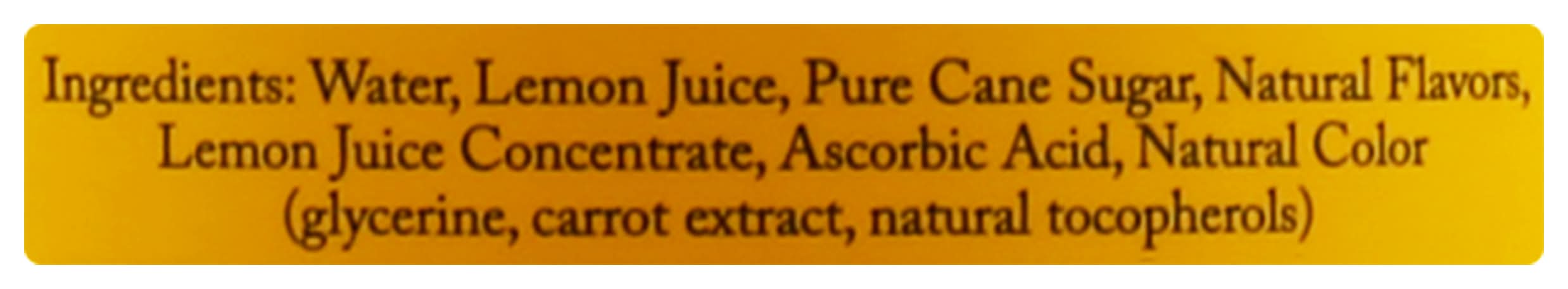 Water, Lemon Juice, Pure Cane Sugar, Natural Flavors, Lemon Juice Concentrate, Ascorbic Acid, Natural Color (Glycerine, Carrot Extract, Natural Tocopherols) Contains: 'Free From Gluten'