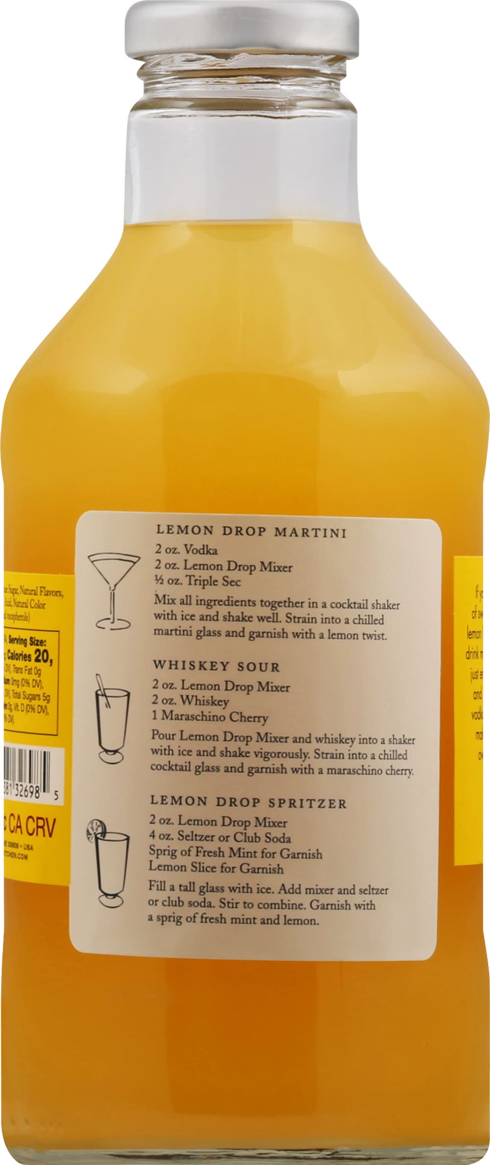 Directions for use: Shake well before using. Lemon Drop Martini: 2 oz Vodka; 2 oz Lemon Drop Mixer; 1/2 oz Triple Sec. Mix all ingredients together in a cocktail shaker with ice and shake well. Strain into a chilled martini glass and garnish with a lemon twist. Whiskey Sour: 2 oz Lemon Drop Mixer; 2 oz Whiskey; 1 Maraschino Cherry. Pour Lemon Drop Mixer and whiskey into a shaker with ice and shake vigorously. Strain into a chilled cocktail glass and garnish with a maraschino cherry. Lemon Drop Spritzer: 2 oz Lemon Drop Mixer; 4 oz Seltzer or Club Soda; Sprig of Fresh Mint for Garnish; Lemon Slice for Garnish. Fill a tall glass with ice. Add mixer and seltzer or club soda. Stir to combine. Garnish with a sprig of fresh mint and lemon. Refrigerate after opening. Storage recommendation: Refrigerate after opening.