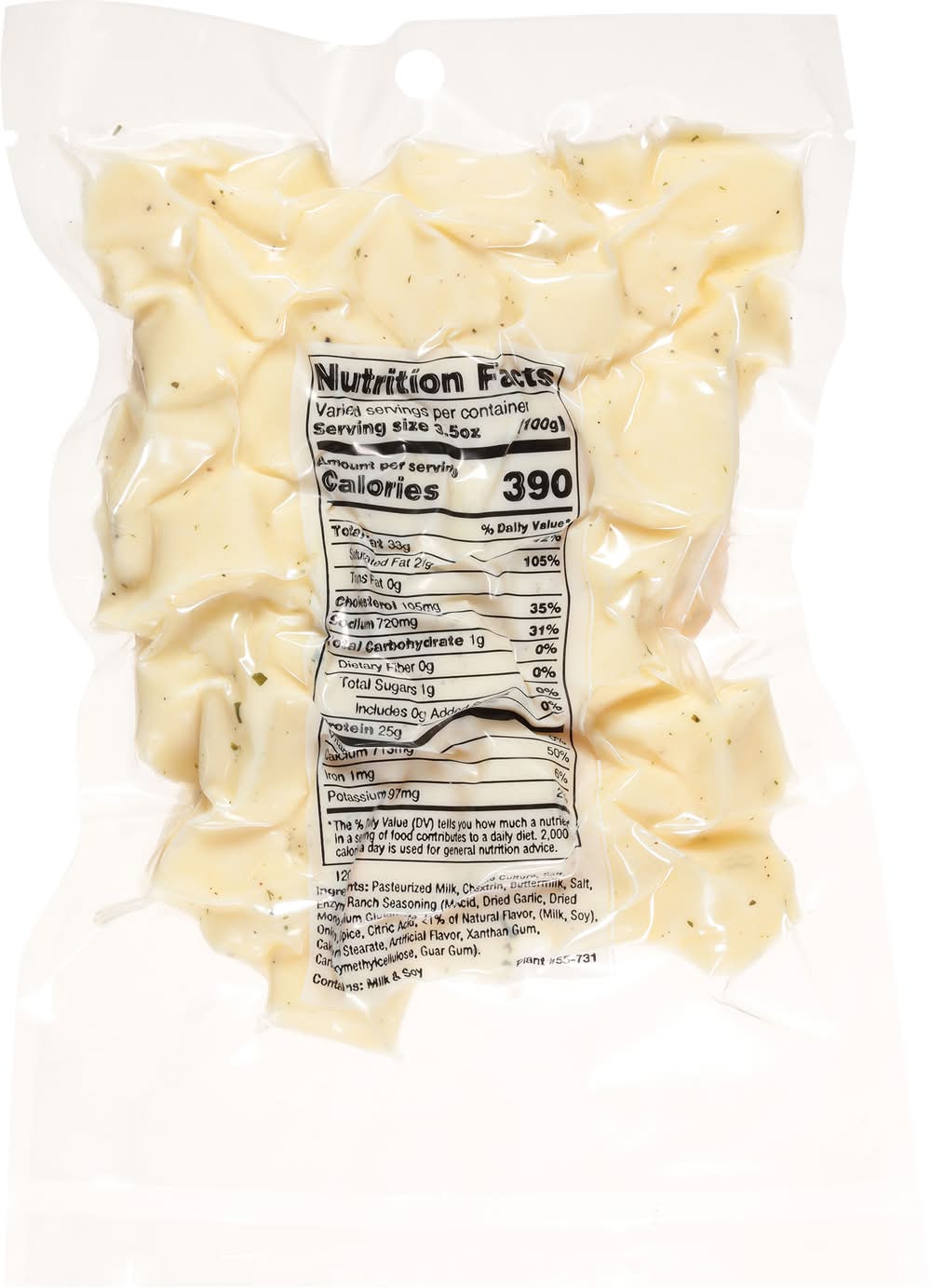Pasteurized Milk, Cheese Culture, Salt, Enzymes, Ranch Seasoning (Maltodextrin, Buttermilk, Salt, Monosodium Glutamate, Lactic Acid, Dried Garlic, Dried Onion, Spice, Citric Acid, <1% of Natural Flavor, (Milk, Soy), Calcium Stearate, Artificial Flavor, Xanthan Gum, Carboxymethylcellulose, Guar Gum) Contains: Milk, Soybeans