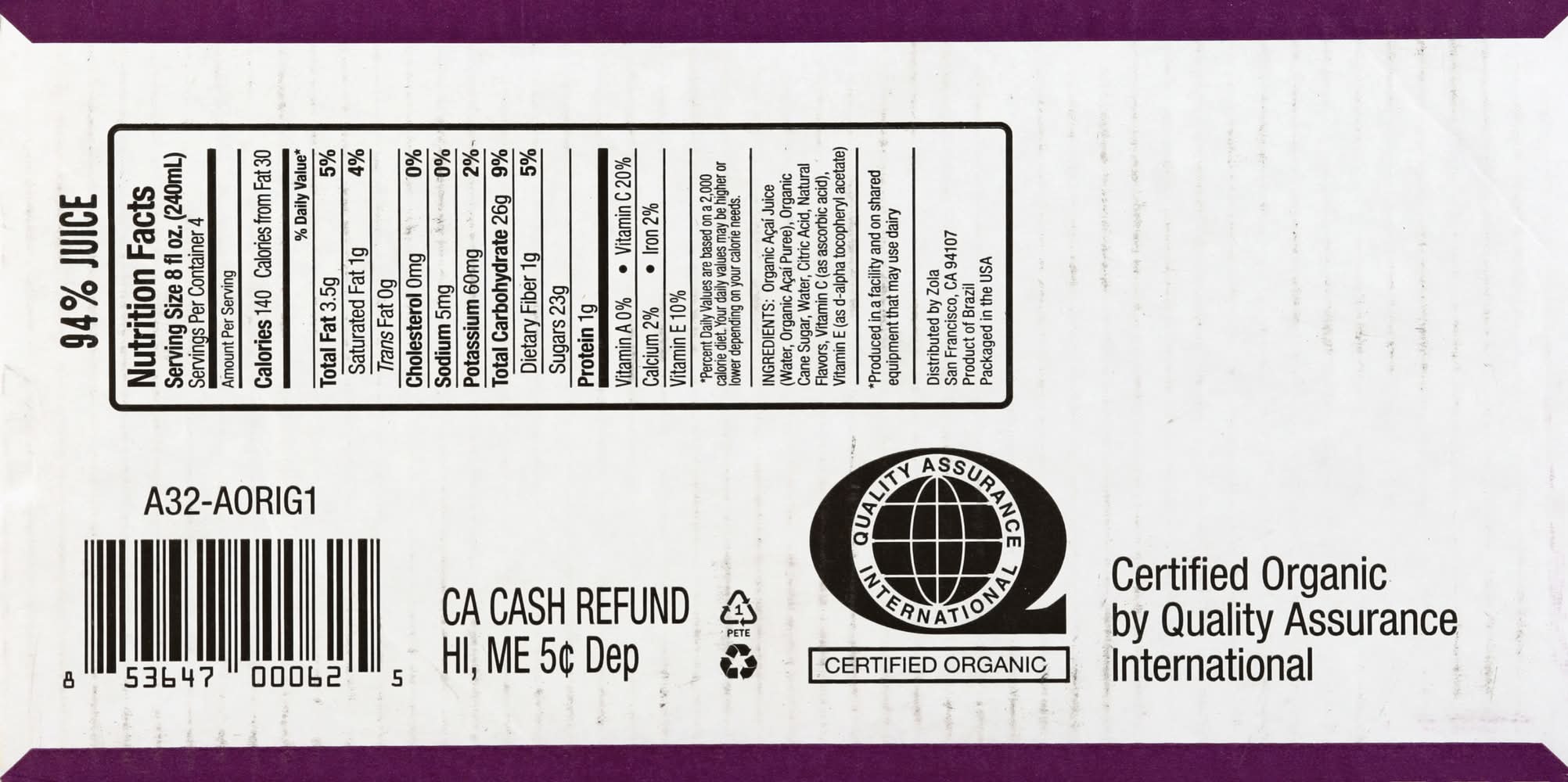 Acai Juice Beverage, Organic, Original Acai ZOLA,