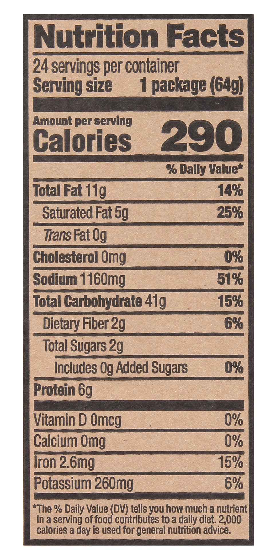 Enriched Flour (Wheat Flour, Niacin, Reduced Iron, Thiamine Mononitrate, Riboflavin, Folic Acid), Palm Oil, Salt, Dried Carrot Flake, Contains Less than 2% of Autolyzed Yeast Extract, Citric Acid, Concentrated Green Cabbage Juice, Dextrose, Disodium Guanylate, Disodium Inosinate, Disodium Succinate, Dried Corn, Dried Parsley, Egg White, Garlic Powder, Hydrolyzed Corn Protein, Hydrolyzed Soy Protein, Lactose, Maltodextrin, Natural and Artificial Flavor, Onion Powder, Potassium Carbonate, Potassium Chloride, Powdered Chicken, Rendered Chicken Fat, Silicon Dioxide, Sodium Alginate, Sodium Carbonate, Sodium Tripolyphosphate, Soybean, Spice and Color, Sugar, TBHQ (Preservative), Wheat Contains: Wheat, Corn, Eggs, Soybeans, Lactose, Peanuts, Tree Nuts, Sesame, Crustacean Shellfish, Fish