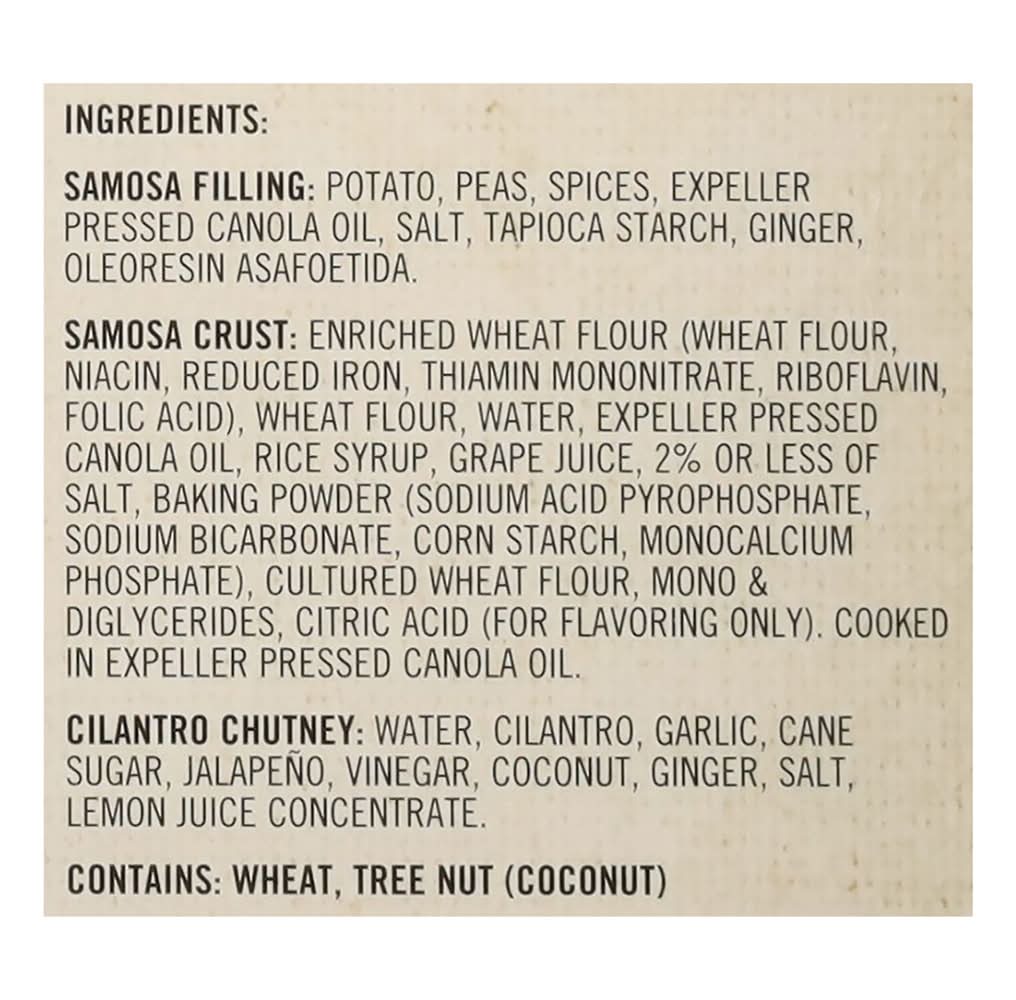 Samosa Filling: Potato, Peas, Spices, Expeller Pressed Canola Oil, Salt, Tapioca Starch, Ginger, Oleoresin Asafoetida, Samosa Crust: Enriched Wheat Flour (Wheat Flour, Niacin, Reduced Iron, Thiamin Mononitrate, Riboflavin, Folic Acid), Wheat Flour, Water, Expeller Pressed Canola Oil, Rice Syrup, Grape Juice, 2% or Less of Salt, Baking Powder (Sodium Acid Pyrophosphate, Sodium Bicarbonate, Corn Starch, Monocalcium Phosphate), Cultured Wheat Flour, Mono & Diglycerides, Citric Acid (for Flavoring Only), Cooked in Expeller Pressed Canola Oil, Cilantro Chutney: Water, Cilantro, Garlic, Cane Sugar, Jalapeño, Vinegar, Coconut, Ginger, Salt, Lemon Juice Concentrate Contains: Wheat, Corn, Tree Nuts, Coconuts
