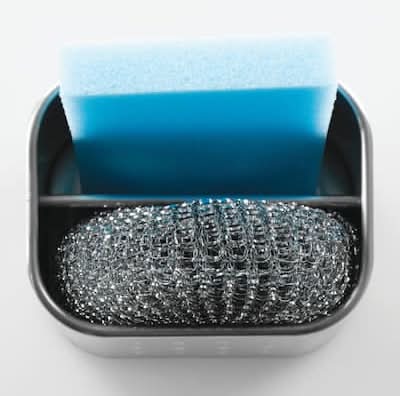 The iDesign two-tiered sponge and scrubber holder is a compact organizer to keep items close at hand. Made with a rust-resistant stainless steel to hold up to every day use. The bottom has a non-absorbent foam base to keep organizer in place on wet countertops.
