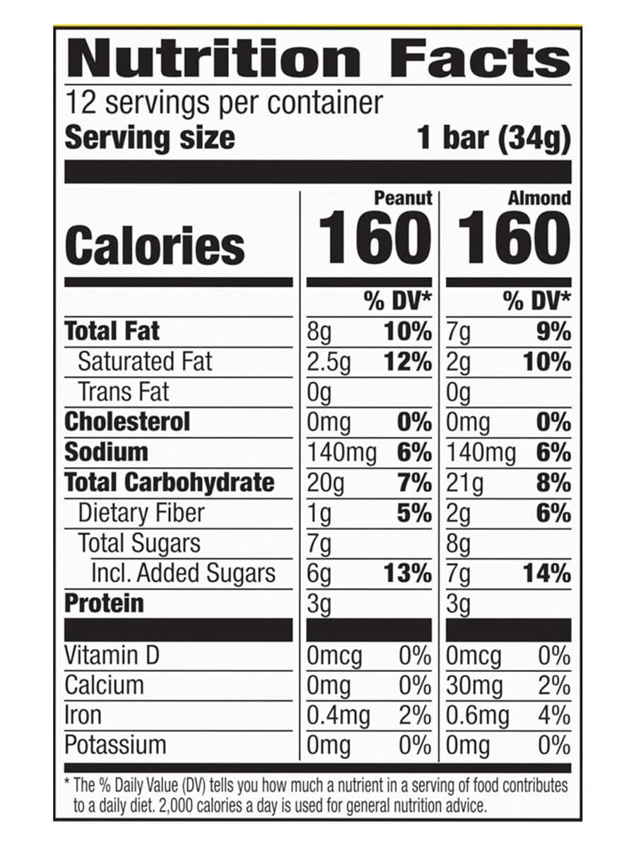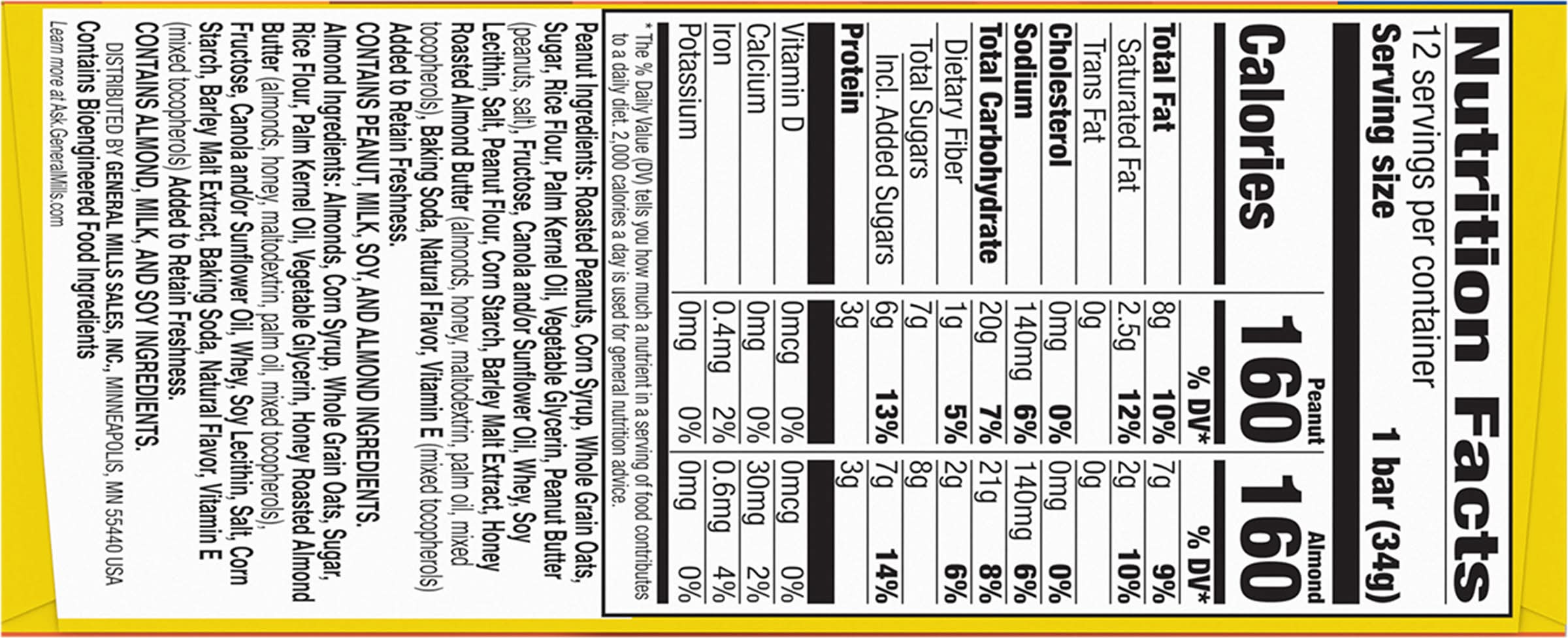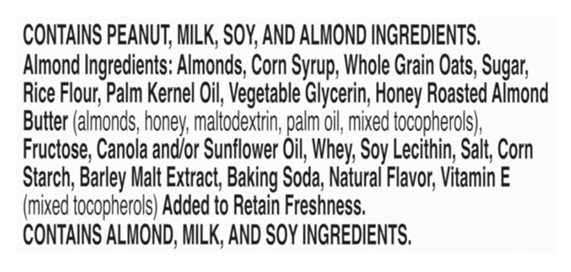 Ingredients: Peanut: Peanut Ingredients: Roasted Peanuts, Corn Syrup, Whole Grain Oats, Sugar, Rice Flour, Palm Kernel Oil, Vegetable Glycerin, Peanut Butter (Peanuts, Salt), Fructose, Canola and/or Sunflower Oil, Whey, Soy Lecithin, Salt, Peanut Flour, Corn Starch, Barley Malt Extract, Honey Roasted Almond Butter (Almonds, Honey, Maltodextrin, Palm Oil, Mixed Tocopherols), Baking Soda, Natural Flavor, Vitamin E (Mixed Tocopherols) Added to Retain Freshness. Almond: Almond Ingredients: Almonds, Corn Syrup, Whole Grain Oats, Sugar, Rice Flour, Palm Kernel Oil, Vegetable Glycerin, Honey Roasted Almond Butter (Almonds, Honey, Maltodextrin, Palm Oil, Mixed Tocopherols), Fructose, Canola and/or Sunflower Oil, Whey, Soy Lecithin, Salt, Corn Starch, Barley Malt Extract, Baking Soda, Natural Flavor, Vitamin E (Mixed Tocopherols) Added to Retain Freshness. Contains: Peanuts, Milk, Soybeans, Tree Nuts, Almonds, Corn, Oat, Barley