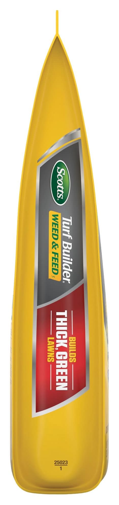 It's time to put a stop to weed-infested lawns - take action with Scotts Turf Builder Weed & Feed5. This weed killer and lawn fertilizer utilizes WeedGrip Technology to grip onto and kill the weeds you see and the ones you don't. It controls over 50 listed weeds, including clover, dandelion, and plantain. In addition, this weed control and lawn food feeds to thicken your lawn and crowd out any future weeds. Apply Scotts Turf Builder Weed & Feed5 when weeds are actively growing and daytime temperatures are consistently between 60°F and 90°F. Make sure your grass is wet from dew or sprinkling, as this helps particles adhere to weed leaves to produce the best results. We recommend using a Scotts spreader to apply this product (please refer to spreader settings on the product label). Do not water your lawn for 24 hours after application or apply if rain is expected within the next 24 hours. Do NOT use on Creeping Bentgrass, St. Augustinegrass (including Floratam), Dichondra, Carpetgrass, and Lippia lawns. Do not allow people and pets to enter lawn until dusts have settled. One 33.95 lb. bag of Scotts Turf Builder Weed & Feed5 covers 12,000 sq. ft.