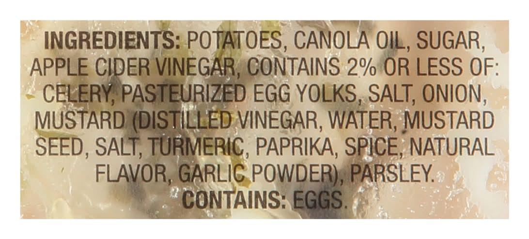 Potatoes, Canola Oil, Sugar, Apple Cider Vinegar, Contains 2% or Less of: Celery, Pasteurized Egg Yolks, Salt, Onion, Mustard (Distilled Vinegar, Water, Mustard Seed, Salt, Turmeric, Paprika, Spice, Natural Flavor, Garlic Powder), Parsley Contains: Eggs, Celery