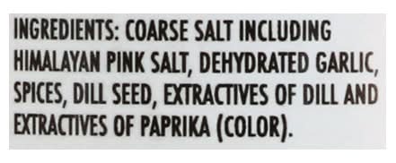 Coarse Salt Including Himalayan Pink Salt, Dehydrated Garlic, Spices, Dill Seed, Extractives of Dill and Extractives of Paprika (Color) Contains: None Additives: None