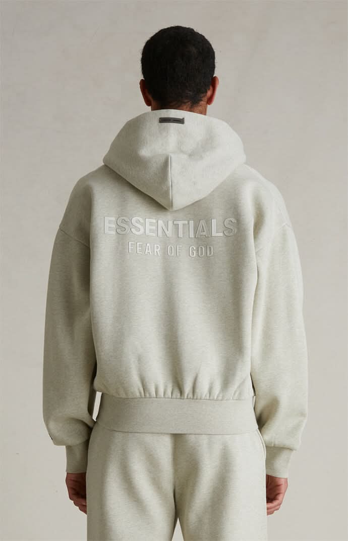 The Fear of God ESSENTIALS Heather Stone Classic Fleece Zip Up Hoodie blends everyday comfort with a signature elevated edge. It’s designed with a soft fleece lining, full double zipper front, dropped shoulder long sleeves, side hand pockets, an attached hood with a rubber brand label, and finished with a metallic ESSENTIALS Fear of God graphic at the back in a classic oversized fit. Solid color hoodie Soft fleece lining Attached hood Long sleeves with dropped shoulders Side hand pockets Full double zipper front closure. Rubber brand label on the hood Metallic ESSENTIALS Fear of God back graphic Classic oversized fit Ribbed cuffs and hem Model is wearing a size medium Model Measurements: 6’2” Height, 30” Waist, 33” Inseam80% cotton, 20% polyester Hand wash, flat or line dry