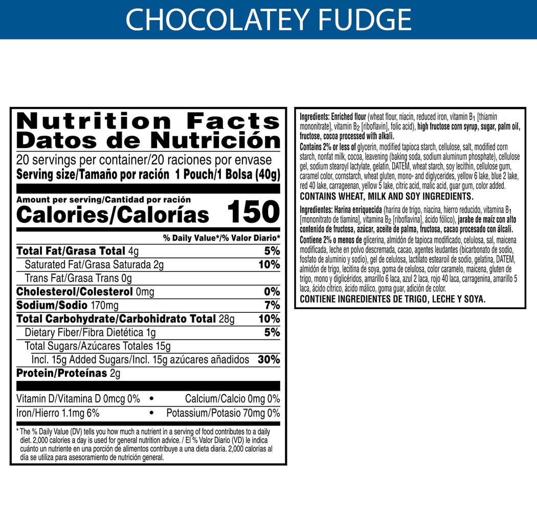 Ingredients: Enriched Flour (Wheat Flour, Niacin, Reduced Iron, Vitamin B1 [Thiamin Mononitrate], Vitamin B2 [Riboflavin], Folic Acid), High Fructose Corn Syrup, Sugar, Palm Oil, Fructose, Cocoa Processed With Alkali. Contains 2% Or Less Of Glycerin, Modified Tapioca Starch, Cellulose, Salt, Modified Corn Starch, Nonfat Milk, Cocoa, Leavening (Baking Soda, Sodium Aluminum Phosphate), Cellulose Gel, Sodium Stearoyl Lactylate, Gelatin, Datem, Wheat Starch, Soy Lecithin, Cellulose Gum, Caramel Color, Cornstarch, Wheat Gluten, Mono- And Diglycerides, Yellow 6 Lake, Blue 2 Lake, Red 40 Lake, Carrageenan, Yellow 5 Lake, Citric Acid, Malic Acid, Guar Gum, Color Added. Contains: CONTAINS WHEAT, MILK AND SOY INGREDIENTS.