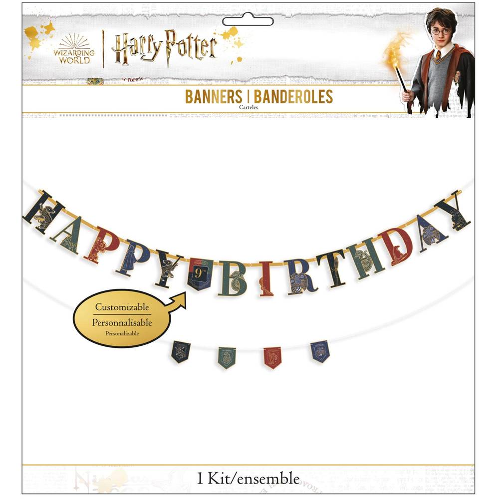 Wish your little witch or wizard a "Happy Birthday" with this two-banner kit. The jointed letter banner has all of the Hogwarts house mascots, plus space on the center shield to add their age. The accent banner has the shield for each of the four Harry Potter houses. pbHarry Potter Hogwarts United Cardstock Birthday Banner Kit product details:/b/p ul liLetter banner ul li10ft wide x 10in tall/li li24 numbers and characters/li li2 each of 0-9/li li1 each of TH, RD, ND, ST/li li5 pieces of double-sided tape/li /ul /li liAccent banner ul liCord, 6ft wide/li li4 cutouts, 6in tall/li /ul /li liPreassembled/li liCardstock/li /ul Amscan,