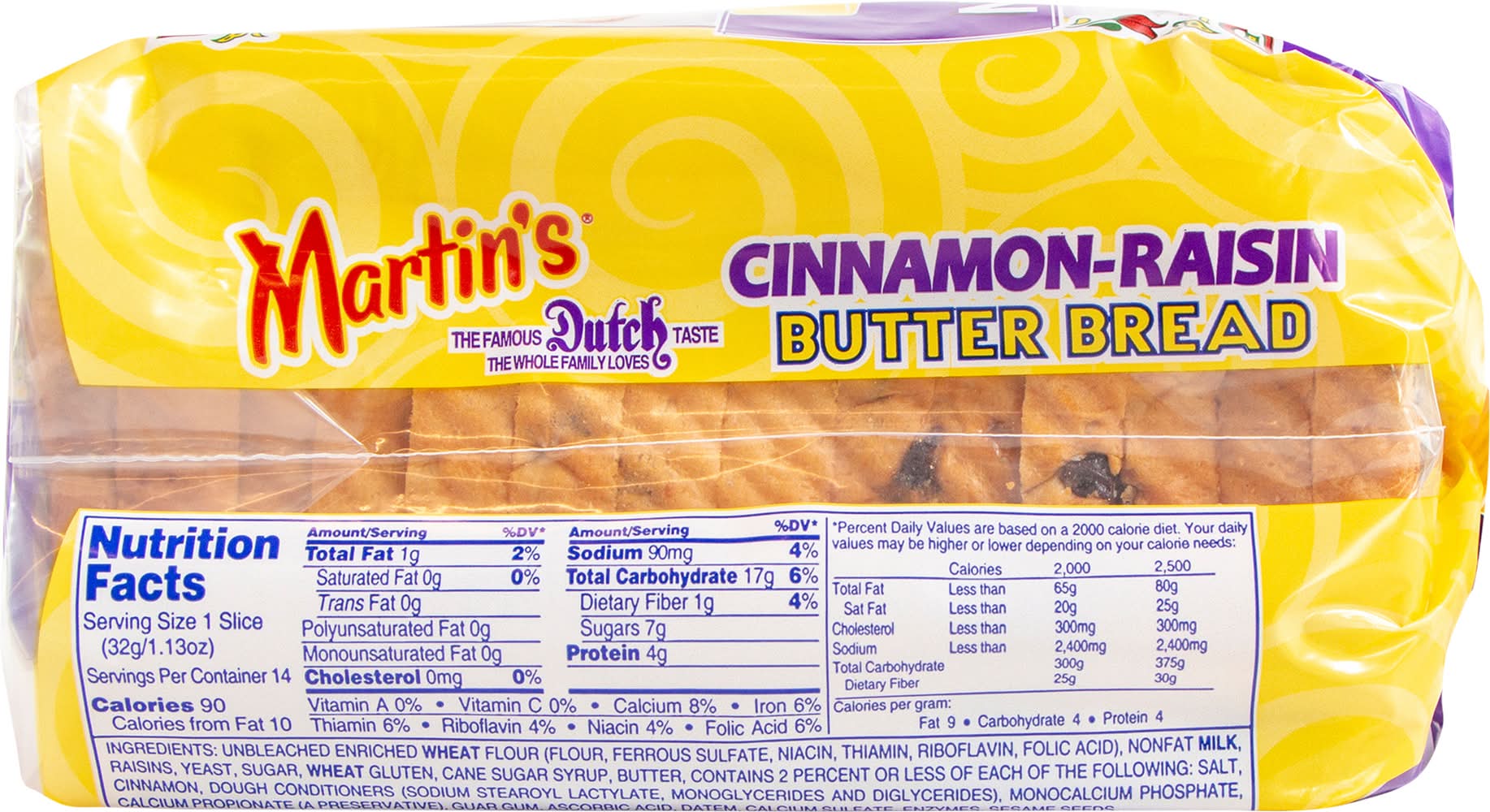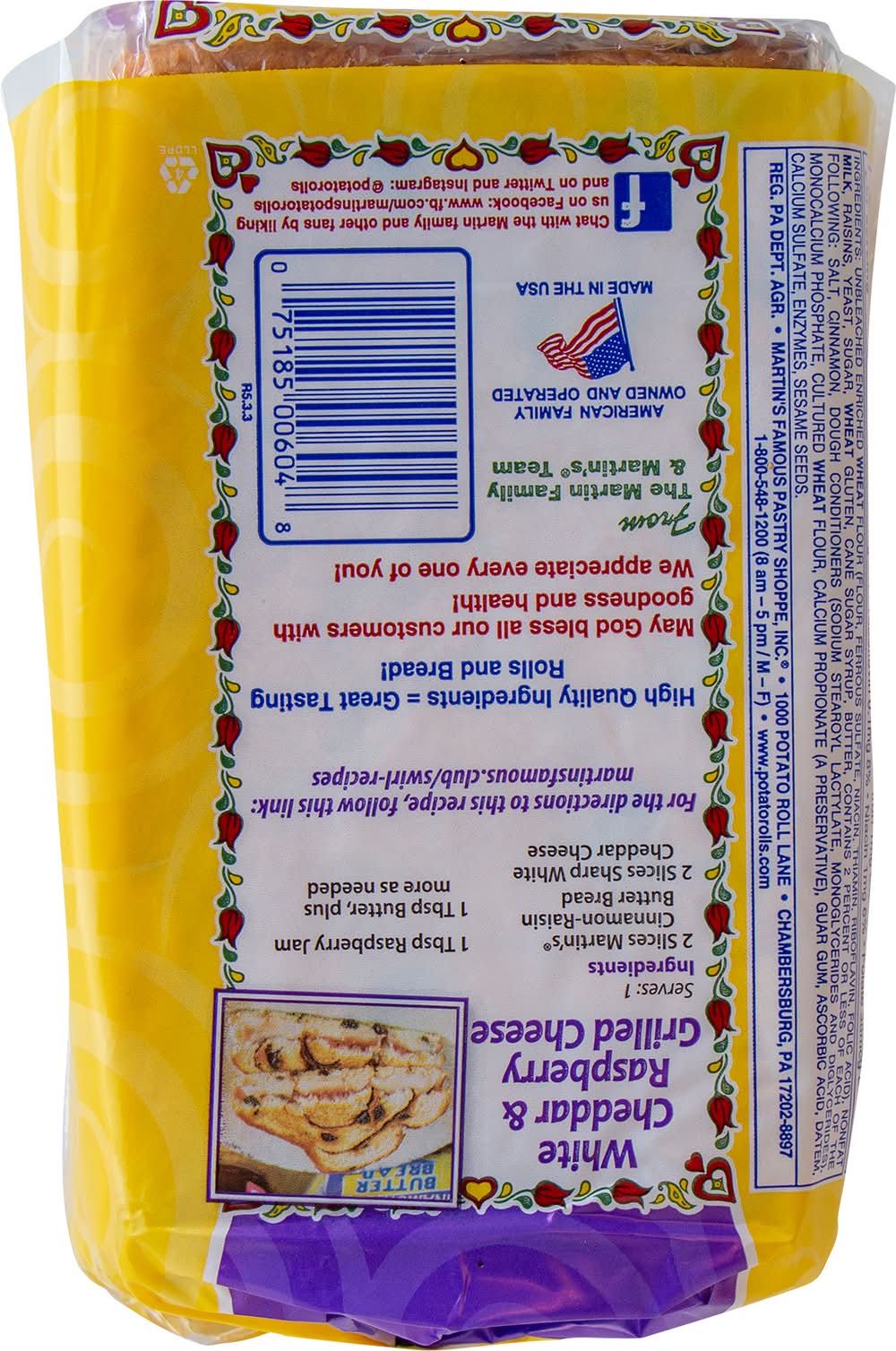 Butter Bread, Cinnamon Raisin • Martin's Famous Pastry Shoppe, Inc., 1000 Potato Roll Lane, Chambersburg, PA, 17202-8897 • Packaging: Reusable