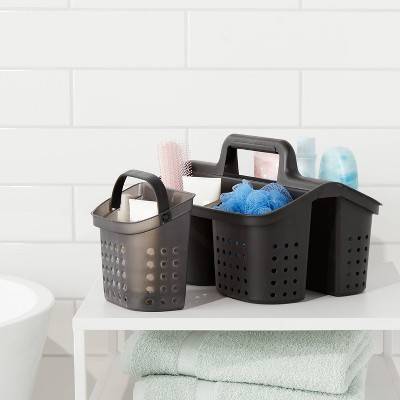 Organize your bath essentials with this 2-in-1 Bath Caddy from Room Essentials This plastic shower caddy has four compartments, two on each side, for storing toothbrushes, shower supplies, small grooming tools and more. This caddy has a flat base for easy placement on your bathroom counters or shelves, and it features a perforated design to help prevent water from accumulating inside. Best of all, it comes with a detachable single caddy with a handle to give you more organizing options. Room Essentials™: Everyday Value