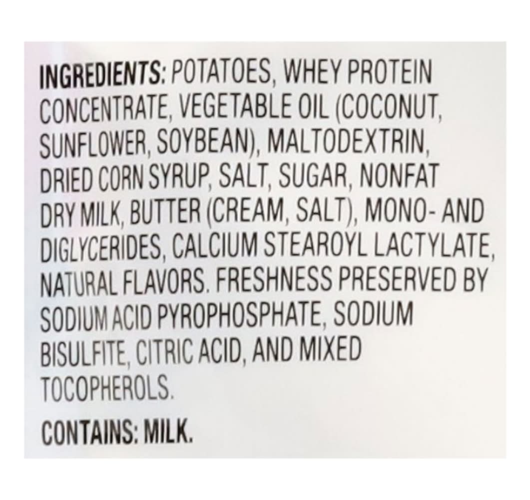 Ingredients: Potatoes, Whey Protein Concentrate, Vegetable Oil (Coconut, Sunflower, Soybean), Maltodextrin, Dried Corn Syrup, Salt, Sugar, Nonfat Dry Milk, Butter (Cream, Salt), Mono- and Diglycerides, Calcium Stearoyl Lactylate, Natural Flavors, Freshness Preserved by Sodium Acid Pyrophosphate, Sodium Bisulfite, Citric Acid, and Mixed Tocopherols Contains: Tree Nuts, Coconuts, Milk, Soybeans, Sulfites