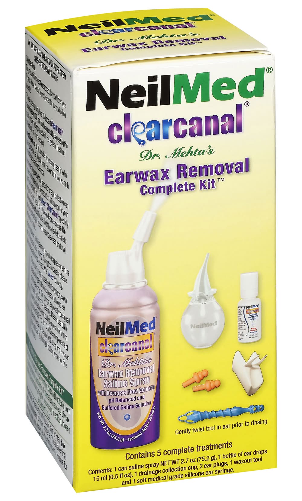 Directions: for use in the ear only. this product is intended for use on adults and children over 12 years of age. consult your physician for use on children under 12. tilt head sideways and place 10 drops of clearcanal carbamide peroxide into each ear canal by squeezing the plastic dropper bottle provided with this system. the tip of bottle should not enter ear canal. keep drops in ear for 10 minutes by keeping head tilted or placing enclosed ear plugs in ears. it is normal to feel warmth in ear due to carbamide peroxide. remove ear plugs. attach the special drainage collection cup to the canister to avoid the rinse solution dripping out of your ear. flush ears with the neilmed clearcanal specially designed actuator nozzle for 10 seconds or as desired to achieve adequate flushing. gently tilt head side to side to drain out residual liquid and dry ears with a clean dry towel wrapped on a finger. on rare instances, individuals may experience pressure in the ears. if this occurs, stop rinsing. if symptoms persist please seek medical attention or contact neilmed directly. some users prefer to use the bulb syringe, so we are providing a silicone bulb syringe and a tip. the syringe is specially designed to easily pull apart for cleaning. please use only warm purified water at body temperature which is around 98.6 degrees f or 37 degrees c. all the components of the syringe can be cleaned with soap and a water and sterilized by placing in boiling water for five minutes. dr. mehta’s earwax removal complete kit: earwax is important in preventing dirt and bacteria from causing hearing problems. if there is an excess of wax build up, ear rinsing may be necessary to soften, loosen and wash it out. important: please do not discard this printed box and any enclosed printed material. the inside final product may not have all the details you require for the ongoing use of the product. dr. mehta's rule of 10 method for earwax removal: 10 drops per ear. 10 plug ears for minutes, 10 rinse each ear for seconds. please read complete directions before using product. contains 5 complete treatments. adults and children over 12 years of age: tilt head sideways; place 10 drops into each ear; tip of the applicator should not enter ear canal; keep drops in the ears for ten minutes by keeping your head tilted or using earplugs; rinse ears after treatment by gently flushing each ear with neilmed clearcanal spray or bulb syringe; use up to twice per week, or as recommended by your physician.